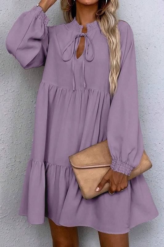 Lavender Women's Casual Chic Tie Neck Smocked Puff Sleeve Dress with Ruffle Hem – Perfect Fit for Any Occasion