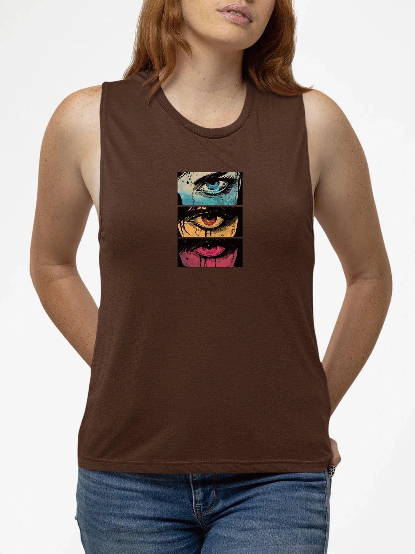 Embrace your artistic side and enjoy the perfect blend of comfort and style with our Abstract Multi-Colored Eyes Print Tank Top. It's more than just a top; it's a canvas for your unique expression. Get yours today and make every outing a fashionable one!