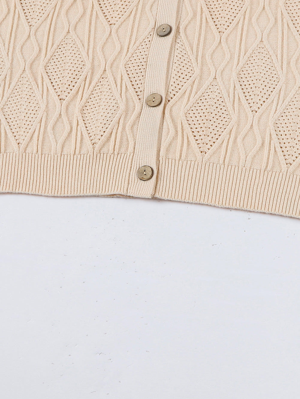 Elevate your style with our elegant and chic Apricot Plus Size Knitted Hollow out Button up Cardigan. Crafted from a blend of viscose, polyester, and polyamide, this cardigan offers both style and comfort.