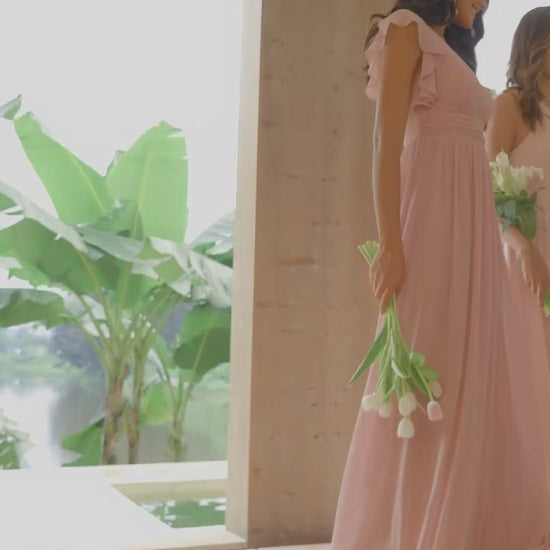 Prepare to captivate in our Back Cutout A-Line Pleated Ruffles Sleeve Chiffon Bridesmaid Dress. Crafted from flowing chiffon, this dress is designed to make you look stunning and sophisticated at any special occasion.
