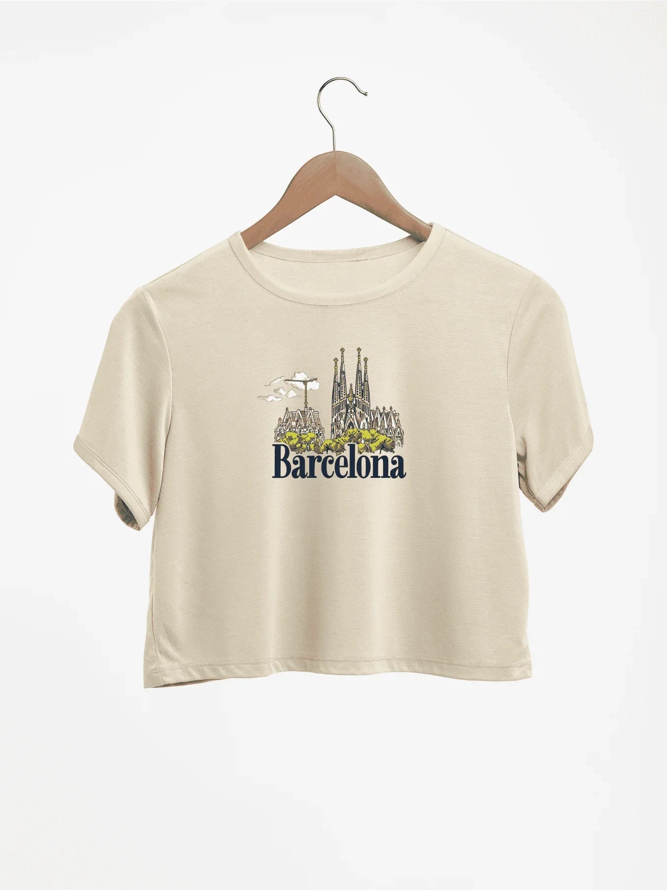 Embrace the spirit of Barcelona and elevate your casual outfit with our Barcelona Skyline With Bold Print Crew Neck Crop T-Shirt. Whether you're exploring the city or relaxing with friends, this t-shirt is a must-have for any fashion-forward woman!
