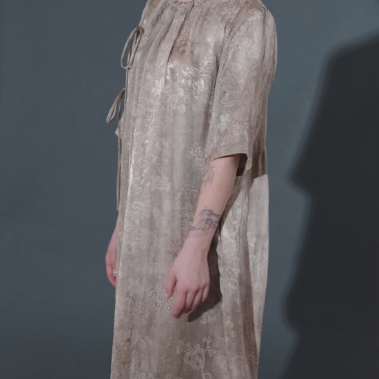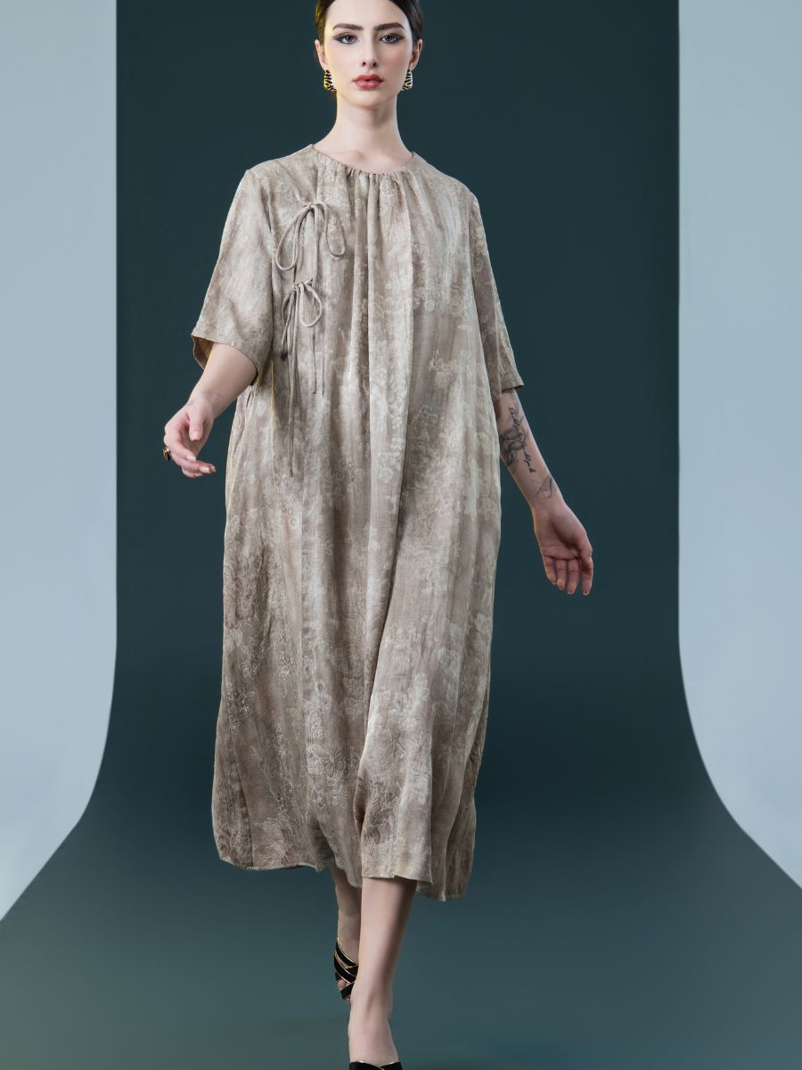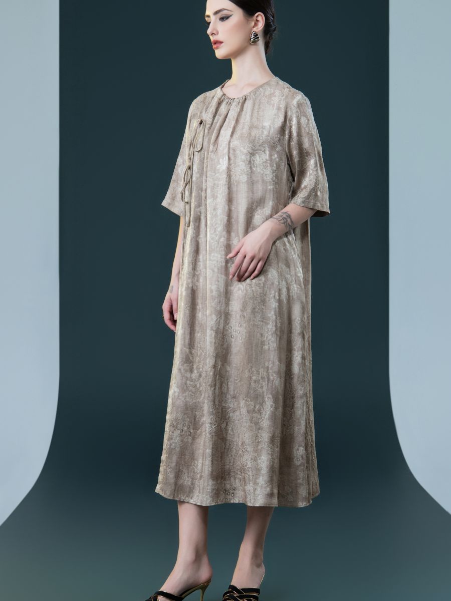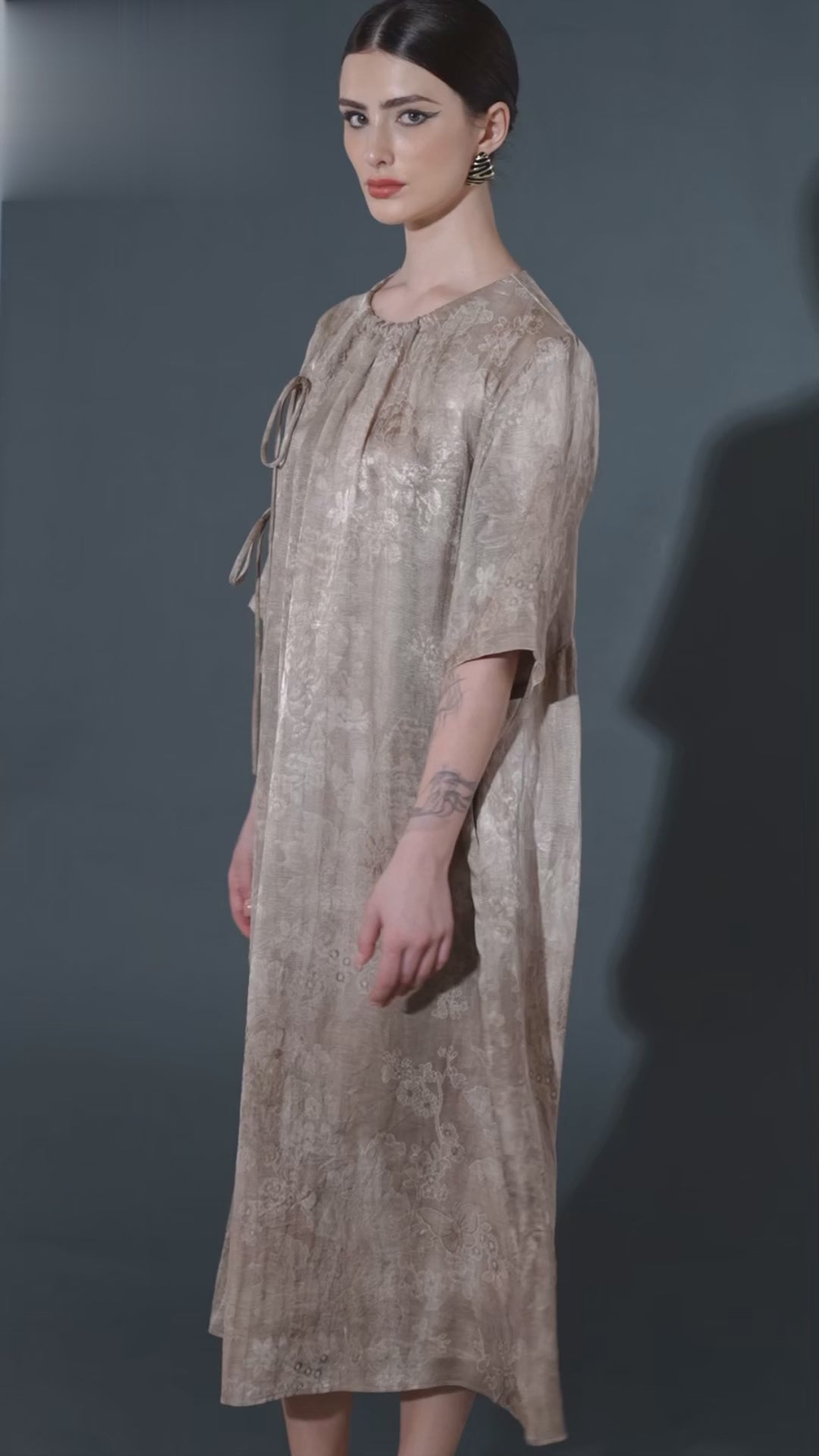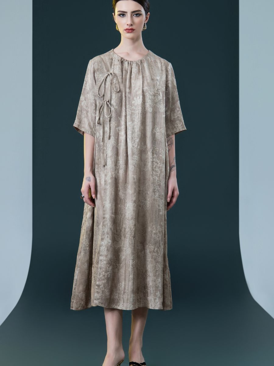 Embrace timeless elegance with this beige floral midi dress. Featuring a delicate floral pattern and a flattering tie detail at the neckline, this dress offers a sophisticated yet comfortable look. The soft, breathable fabric and relaxed fit make it perfect for any occasion, from casual outings to more formal events. Pair with your favorite flats or heels to complete the ensemble.