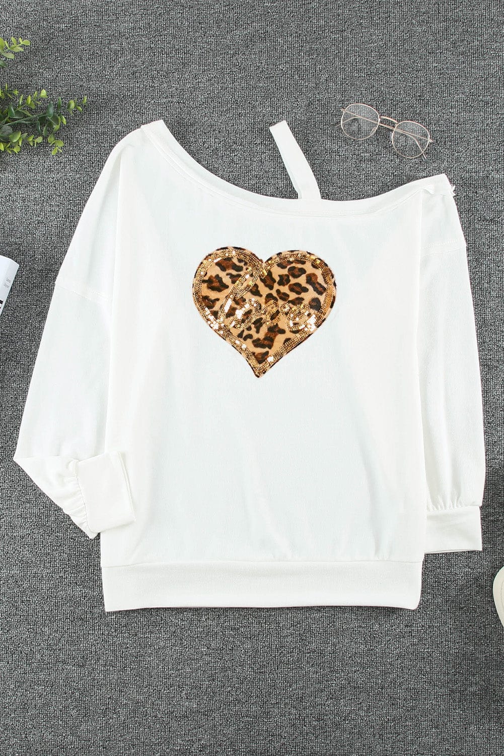 Beige Leopard Sequined Love Heart One Shoulder Top