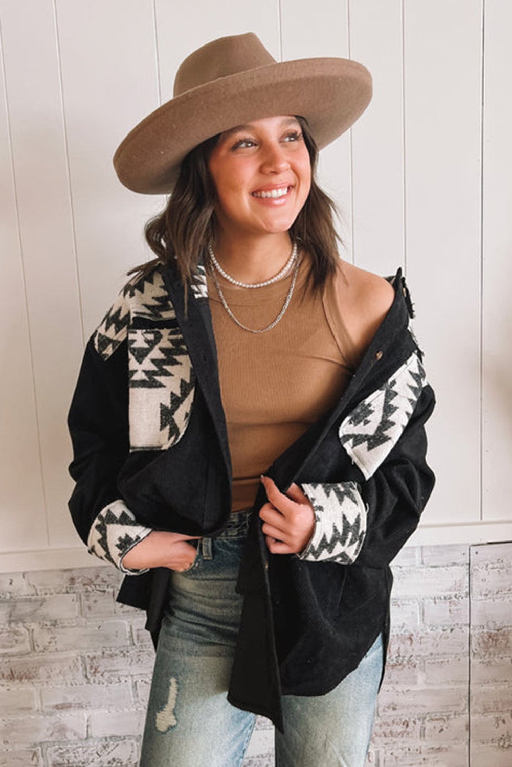Enhance your wardrobe with the Black Aztec Patchwork Buttoned Corduroy Shacket and embrace the blend of comfort and style that it offers!