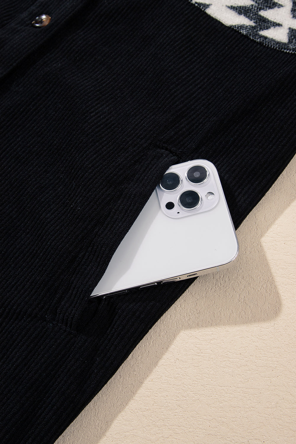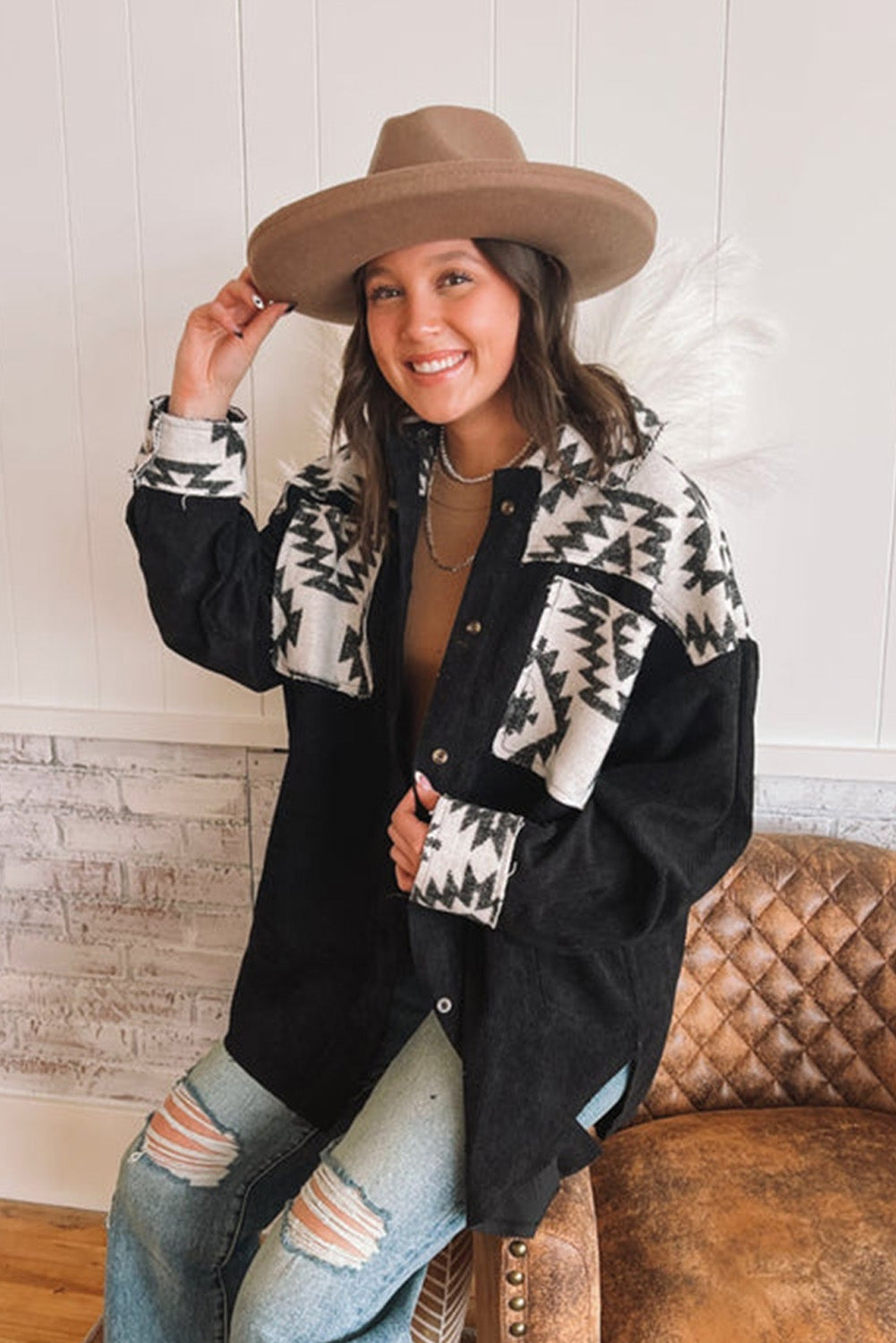 Discover the Black Aztec Patchwork Buttoned Corduroy Shacket