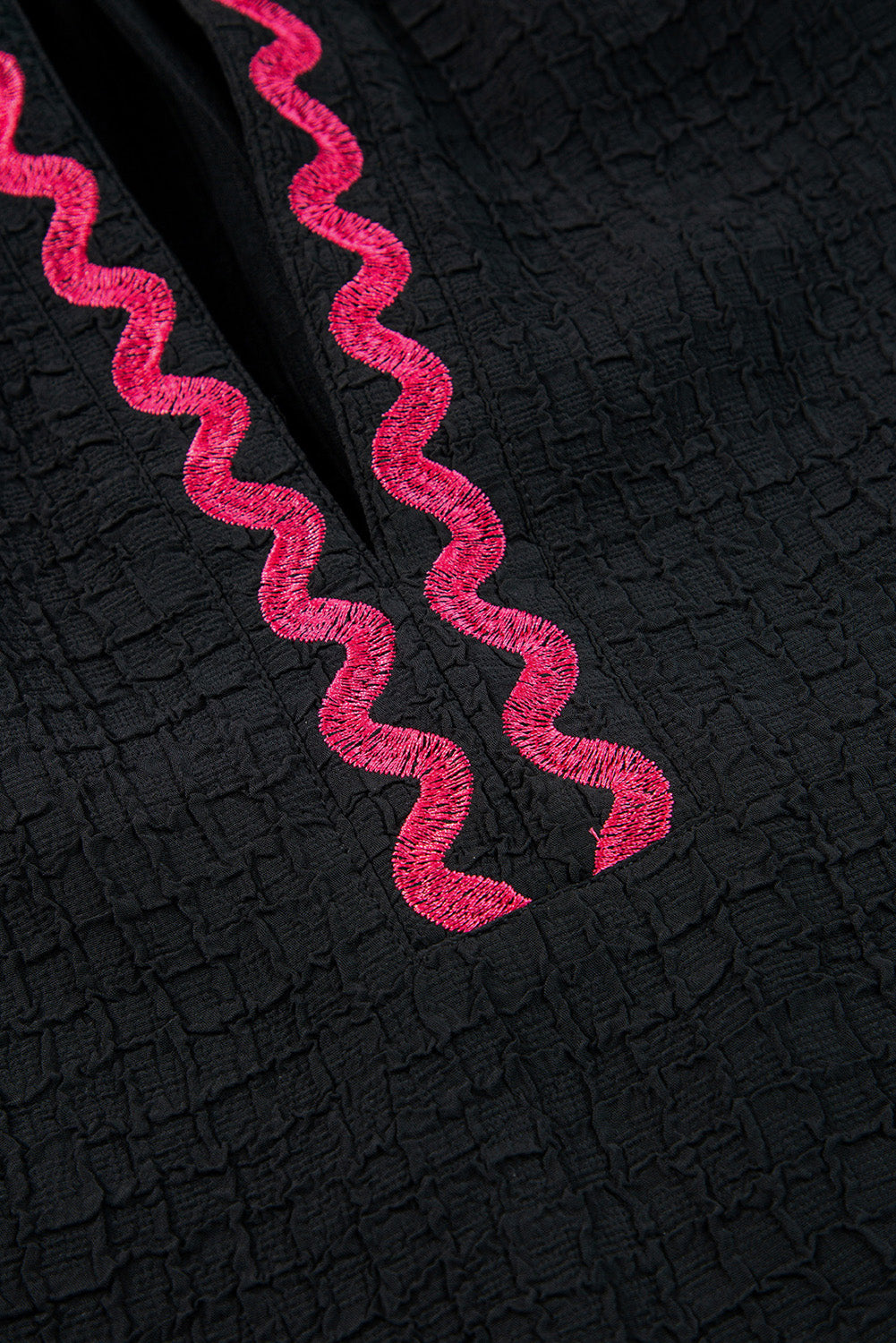 Discover the perfect blend of charm and sophistication with our Black Floral Embroidered Ricrac Puff Sleeve Textured Blouse. This stunning top is designed to elevate your everyday style, making it a must-have addition to your wardrobe.