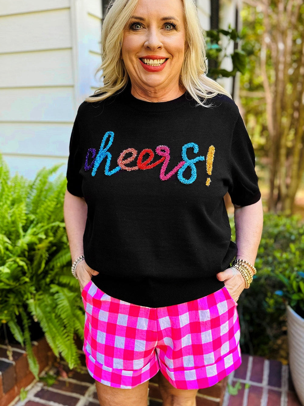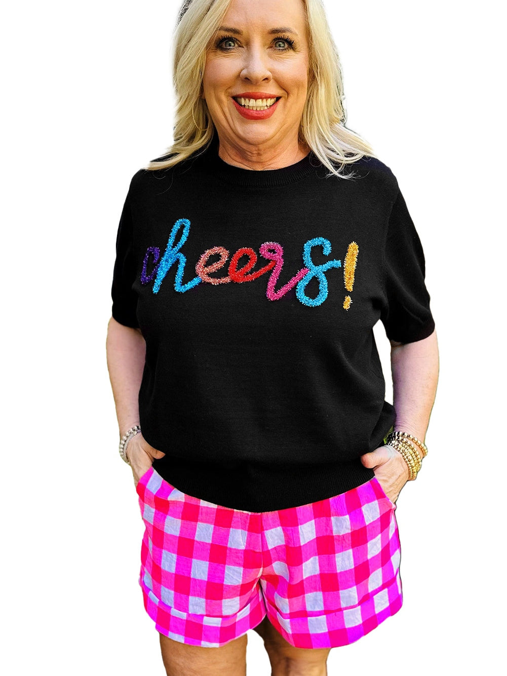 Upgrade Your Style with the Black Plus Size Cheers Glitter Tinsel Short Sleeve Sweater