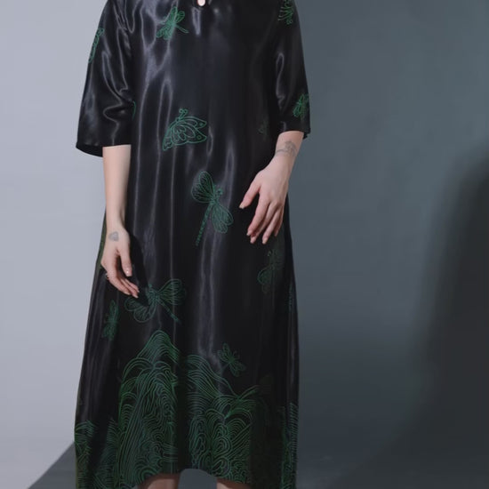 Black Satin Dress with Green Dragonfly Embroidery