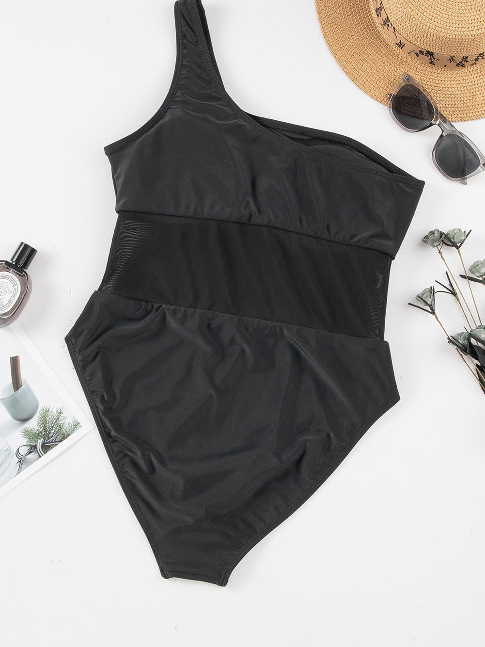 Black Mesh Patchwork One-shoulder Monokini Swimsuit