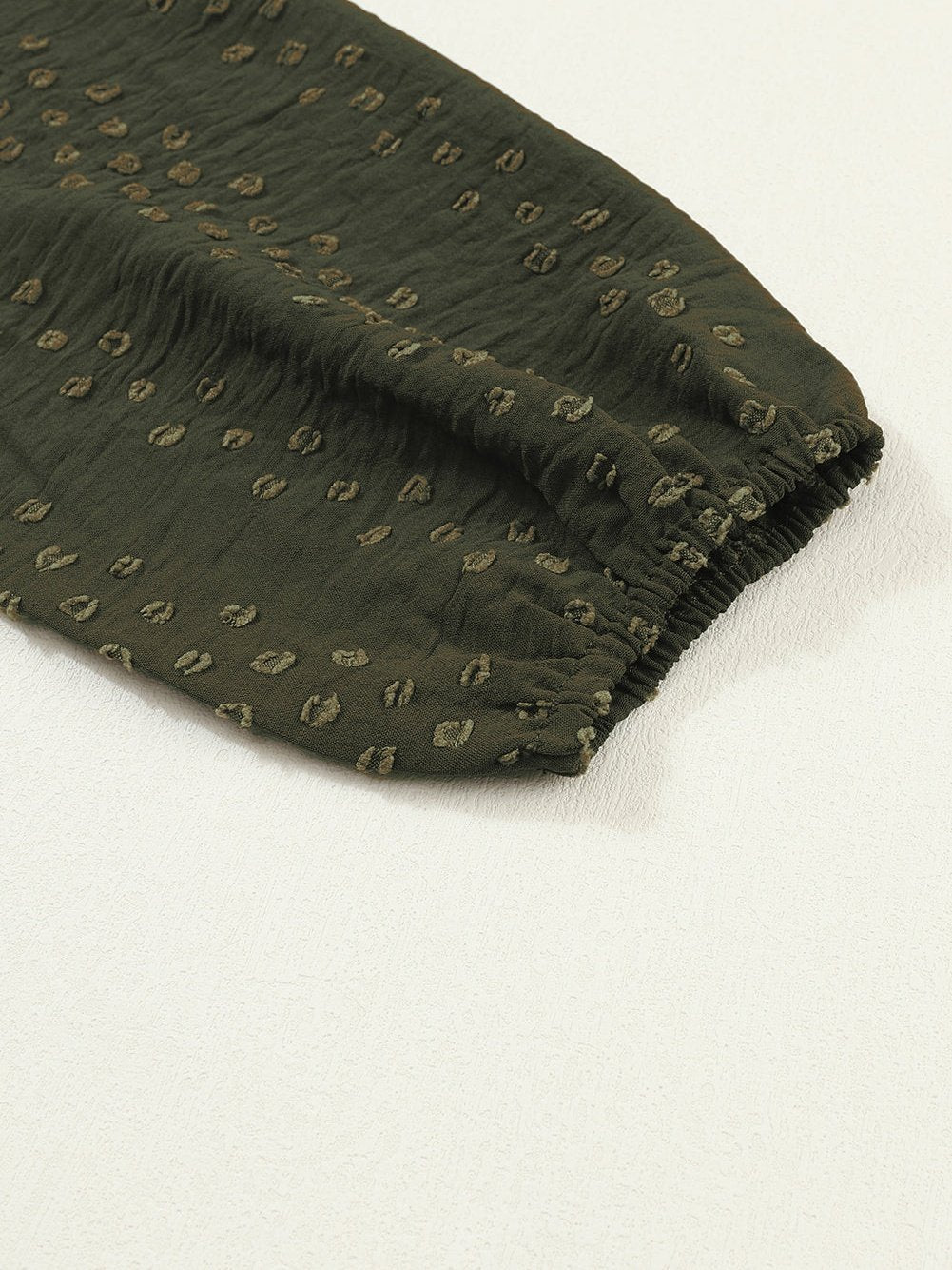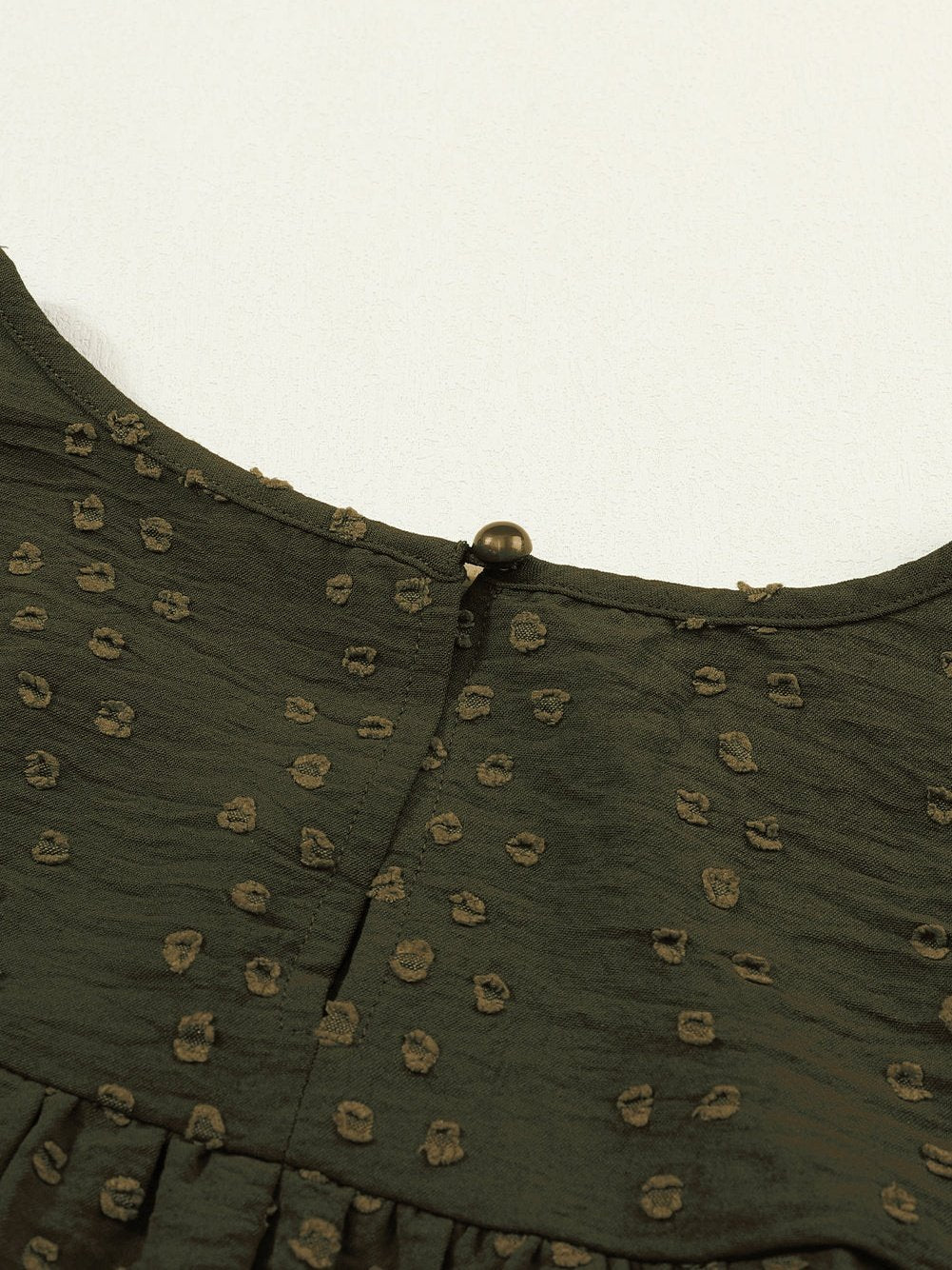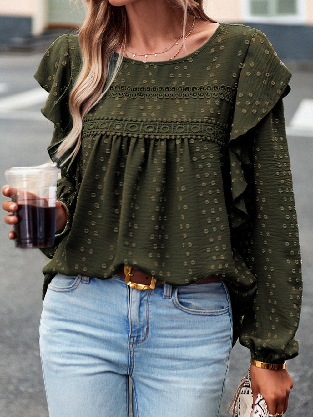 Pretty and sweet, this blackish green blouse is a must-have for your fall wardrobe. The intricate lace eyelet and dotty details give it a charming and elegant look. The ruffled shoulder adds a whimsical touch, reminiscent of a graceful butterfly in motion. Pair it with jeans, shorts, or a skirt for a complete and stylish outfit. Whether for daily wear or special occasions, this blouse is versatile and chic.