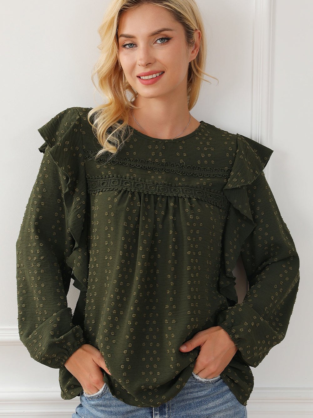 Blackish Green Lace Eyelet Ruffle Shoulder Long Sleeve Blouse