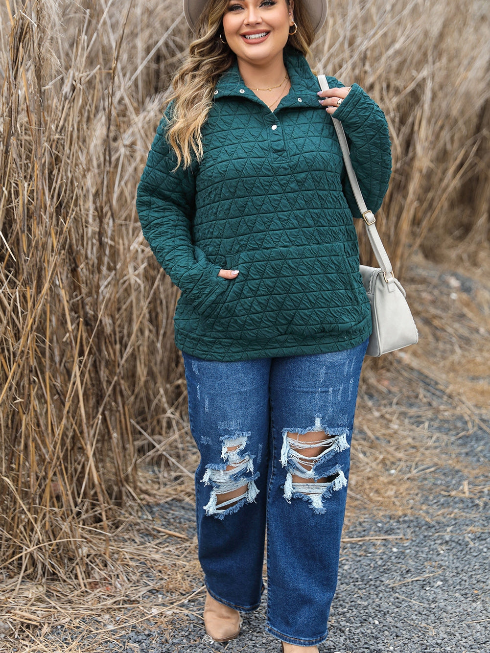 At an evening networking event, the atmosphere is lively and filled with opportunities. You wear the Blackish Green Plus Size Quarter Buttoned Pocketed Quilted Sweatshirt layered over a sleek pencil skirt. The loose fit flatters your figure without compromising on elegance. As you engage in conversation, the unique quilted texture of your sweatshirt catches the light, making a subtle statement. The breathable fabric ensures you remain comfortable while you mingle, making it easy to focus on building connections rather than fidgeting with your outfit.