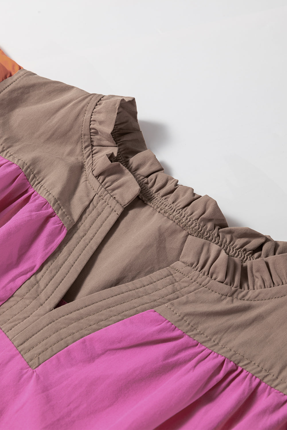 Bonbon Color Block Tiered Notched Neck Ruffle Sleeve Dress
