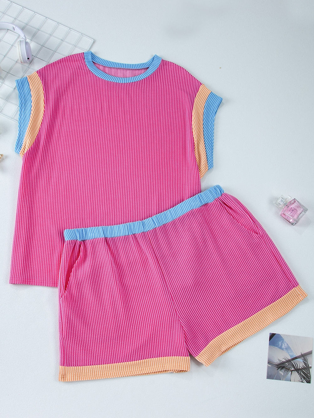 Upgrade Your Loungewear Game with Our Bright Pink Textured Knit Contrast Trim Plus Shorts Set!