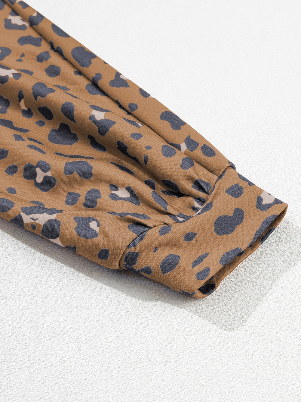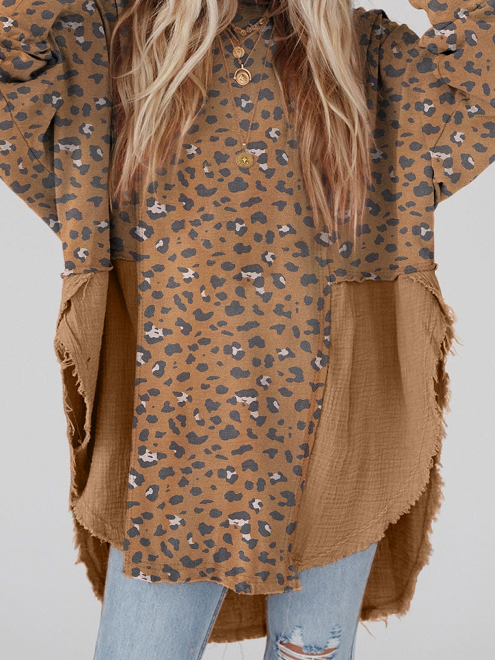 Leopard Patchwork Oversized Brown Blouse with Raw Hem