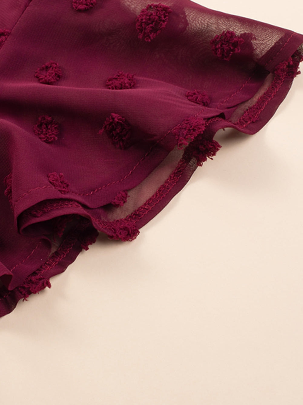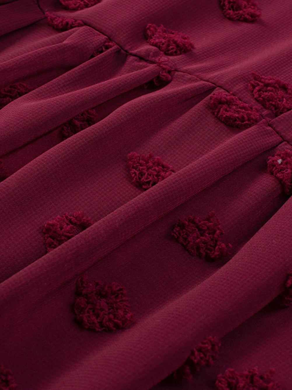 Picture yourself walking into an evening gala, the soft lights reflecting off the elegant decor. The atmosphere is buzzing with excitement as you glide through the crowd in your Burgundy Plus Size Swiss Dot Ruffled Sleeve V Neck Dress. The delicate Swiss dot fabric catches the light, while the ruffled sleeves add a touch of charm. As you engage in meaningful conversations, the V neckline elongates your silhouette, making you feel both comfortable and beautiful. You turn heads as you make your way to the dance floor, confident and radiant.