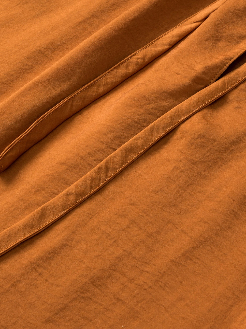Camel Satin Pleated Tied V Neck Puff Sleeve Blouse