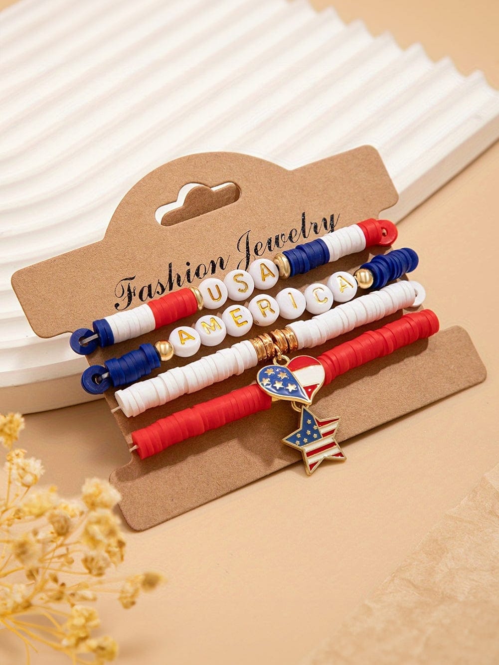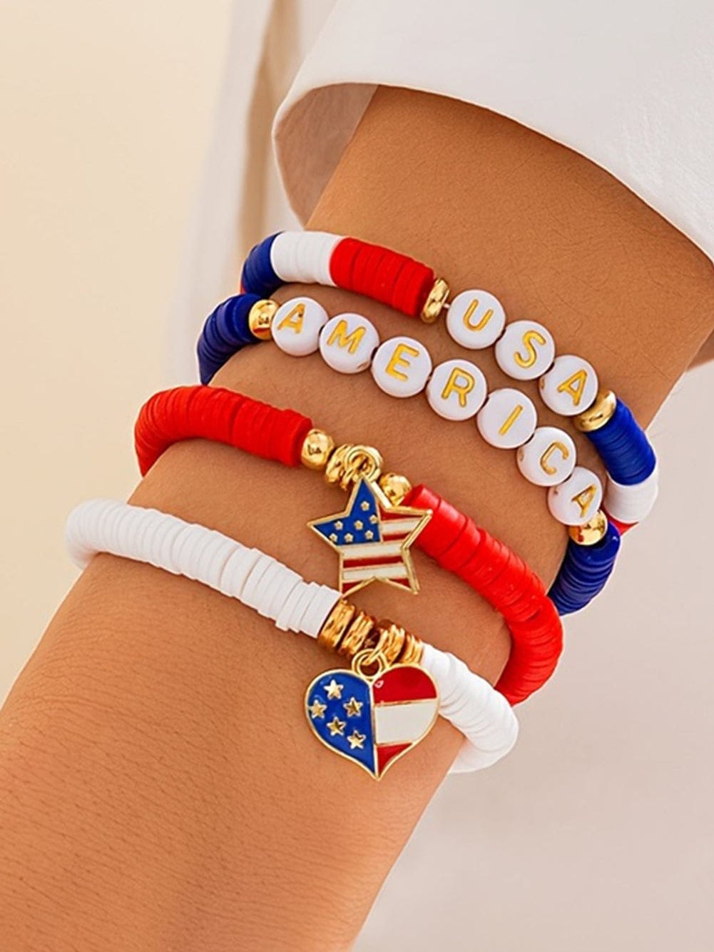 Envision attending an upscale Independence Day celebration held in a beautiful garden setting. You wear a chic black dress, and the American Patriot Multi-Layered Bracelet complements your look perfectly. As fireworks light up the night sky, the bracelet's intricate design shines beautifully, making you feel festive yet elegant. The star and heart pendants symbolize your unwavering patriotism, and the personalized letter beaded detail allows you to showcase your unique identity. In this moment, you embody a proud American, celebrating freedom and unity in style.