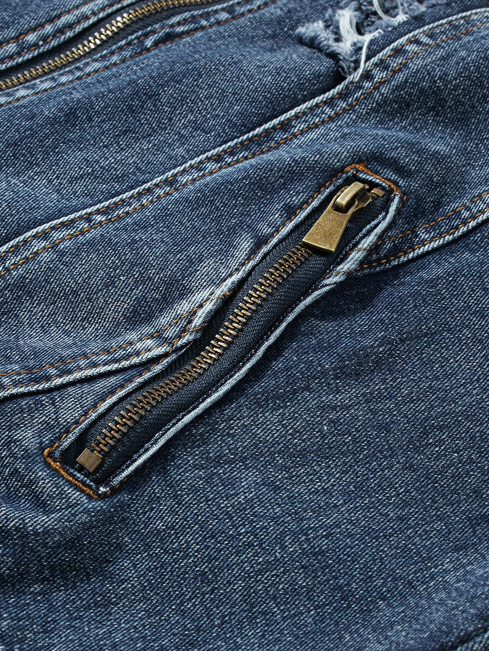 Layered Dark Blue Hooded Zip-Up Denim Jacket with Distressed Detail
