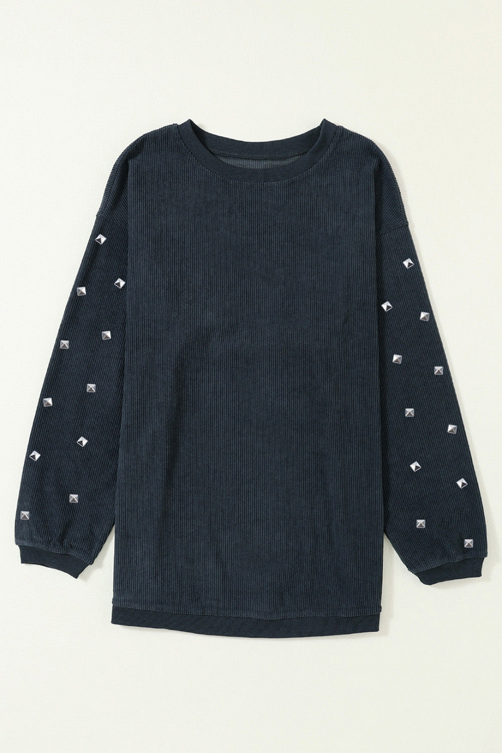 Dark Grey Bead Studded Sleeve Corded Drop Shoulder Sweatshirt