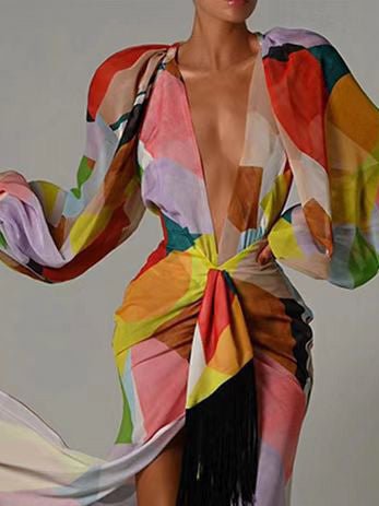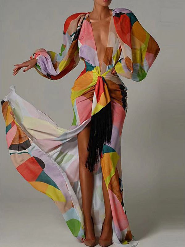 Dresses Deep V Neck Lantern Sleeves Slit Dress for Women
