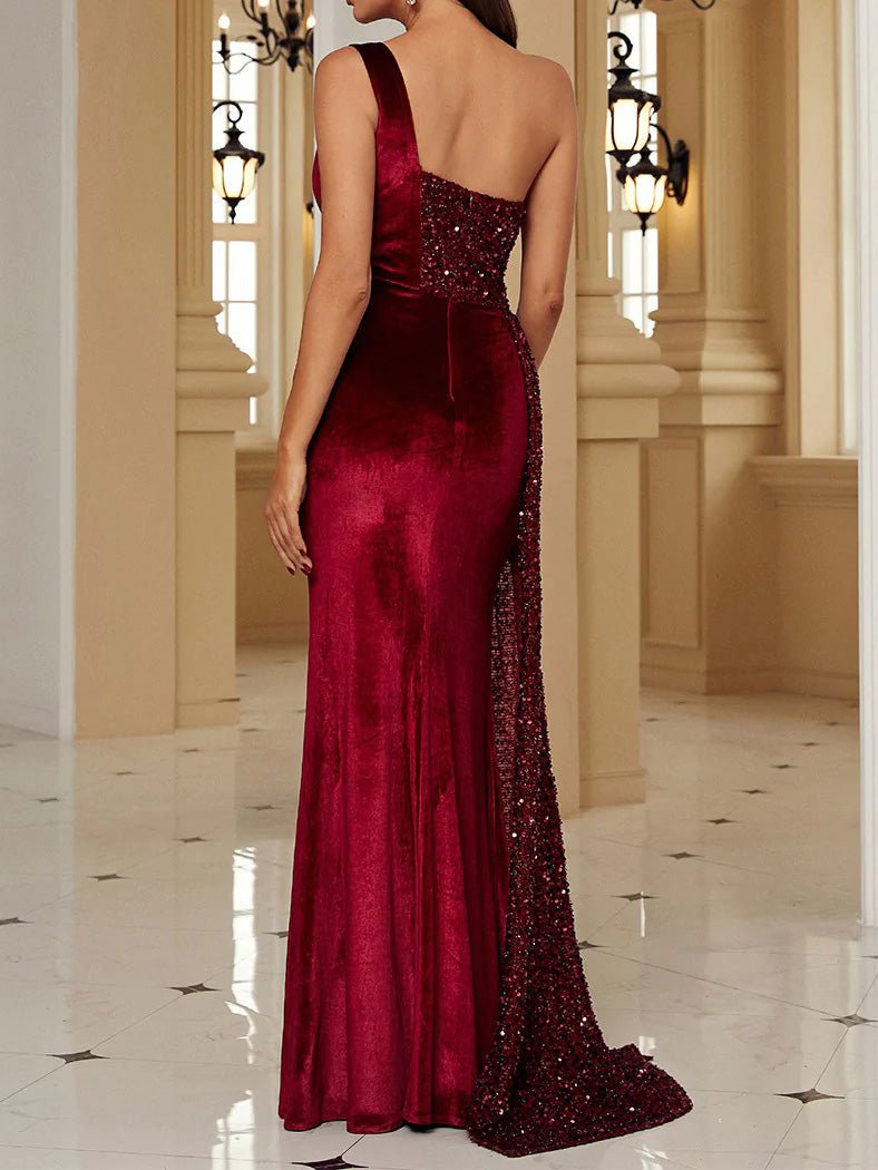 - Feature: One Shoulder, Sequin Panel, Slit, Party