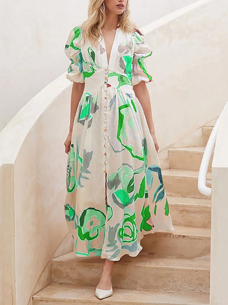 Dresses Ruffled Sleeve Printed Pleated Midi Dress for Women