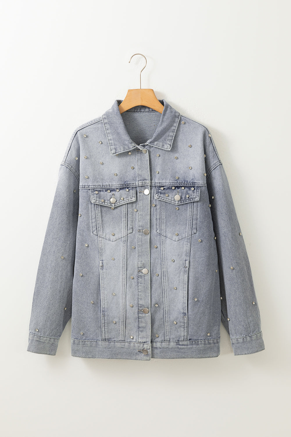 Dusk Blue Rhinestone Embellished Flap Pocket Denim Jacket