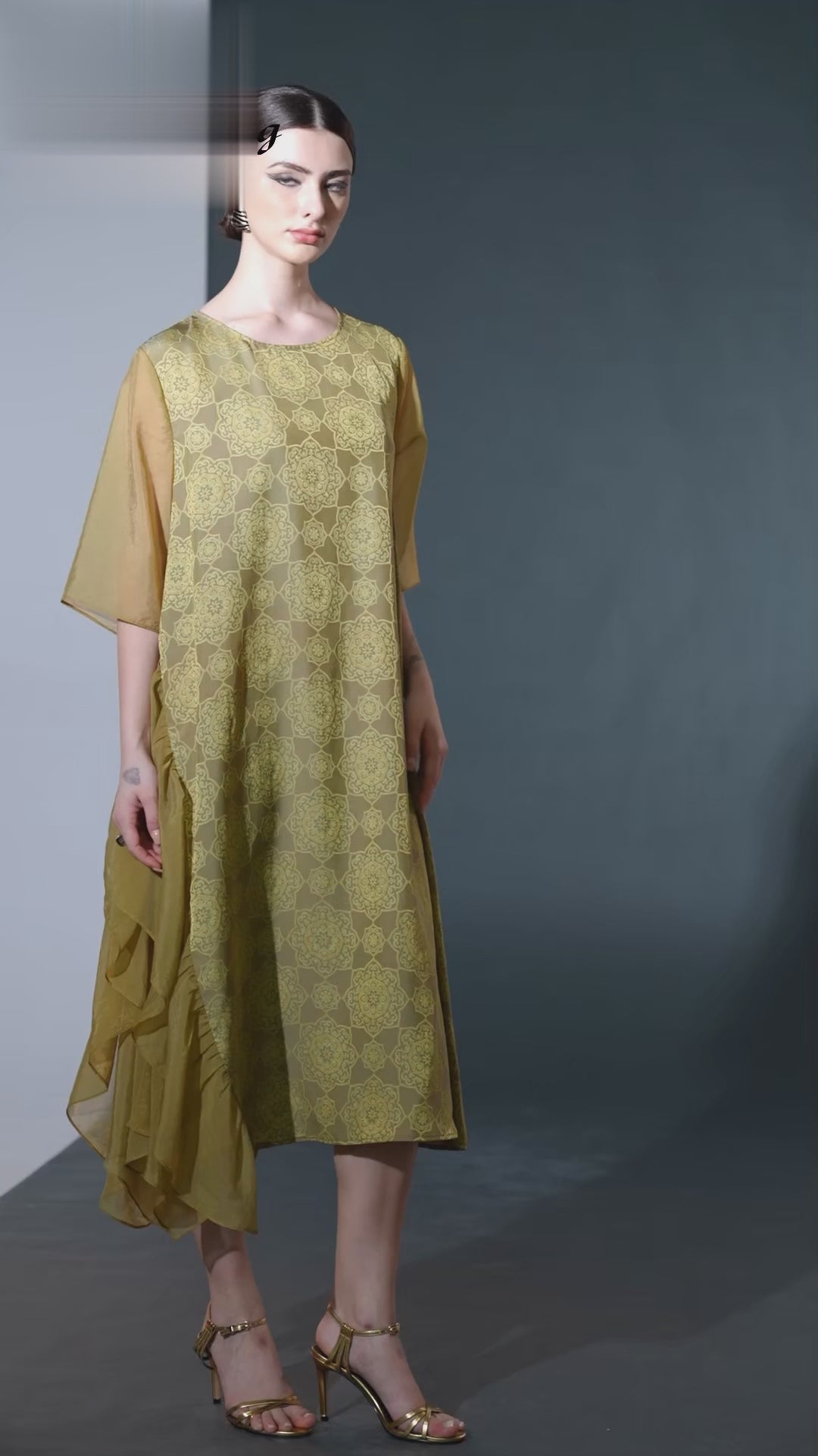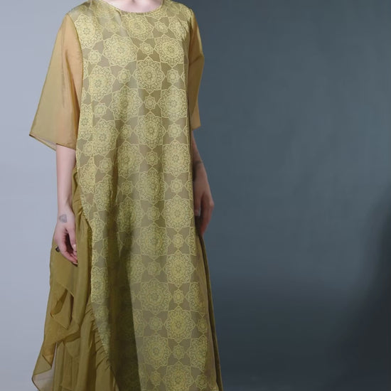 Step into sophistication with this Elegant Geometric Print Midi Dress. Adorned with intricate geometric patterns in soft shades of green, this dress exudes a refined charm. The asymmetrical layered design adds a touch of modern flair, while the sheer sleeves offer an elegant finish. Crafted from high-quality, breathable fabric, this dress ensures comfort and style for any occasion. Perfect for formal events or a stylish day out, this dress is a versatile addition to your wardrobe.