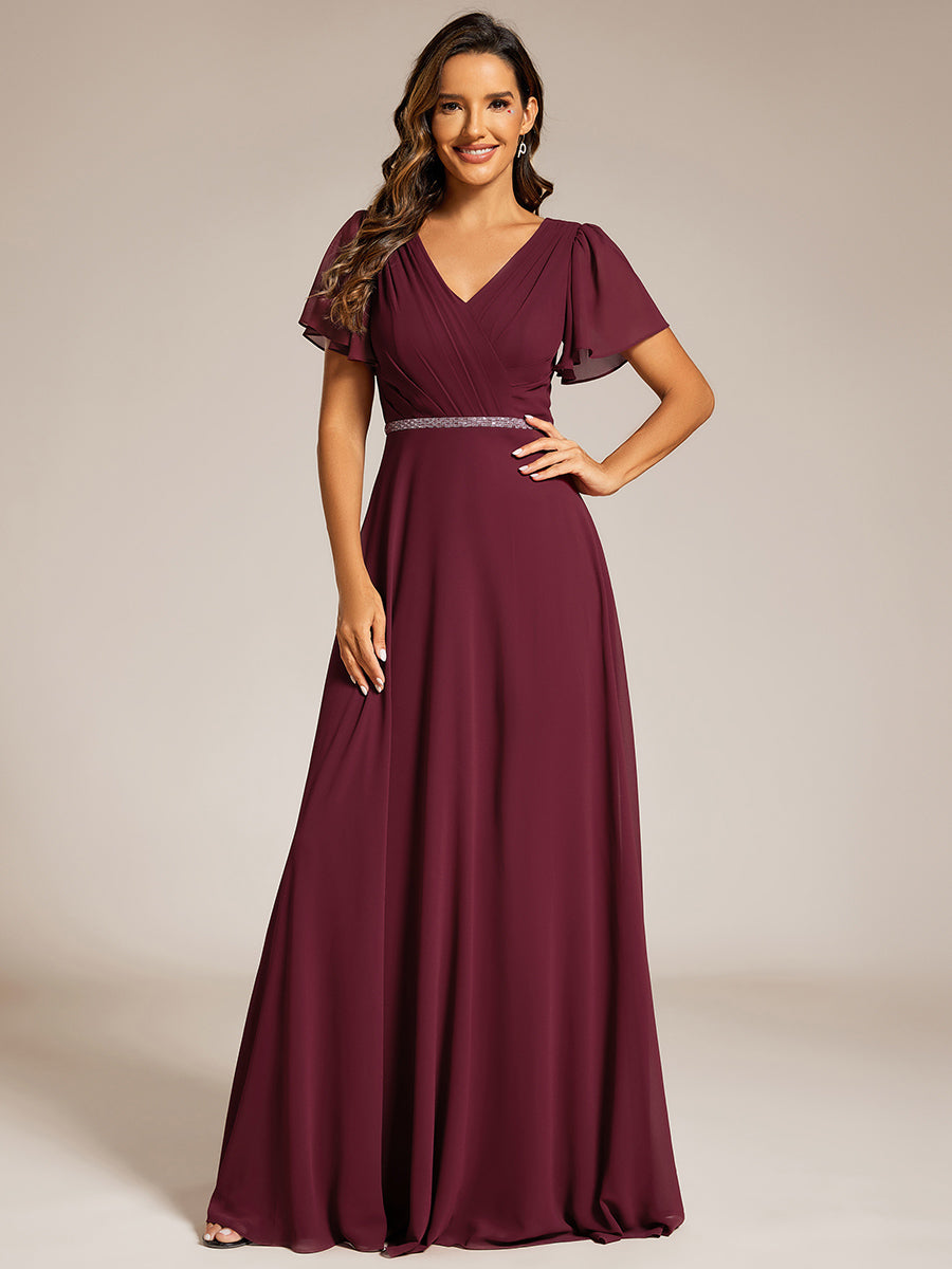 Elegant Midi Length Ruffles Sleeves Chiffon Dresses Empire Waist Evening Dresses with Belt