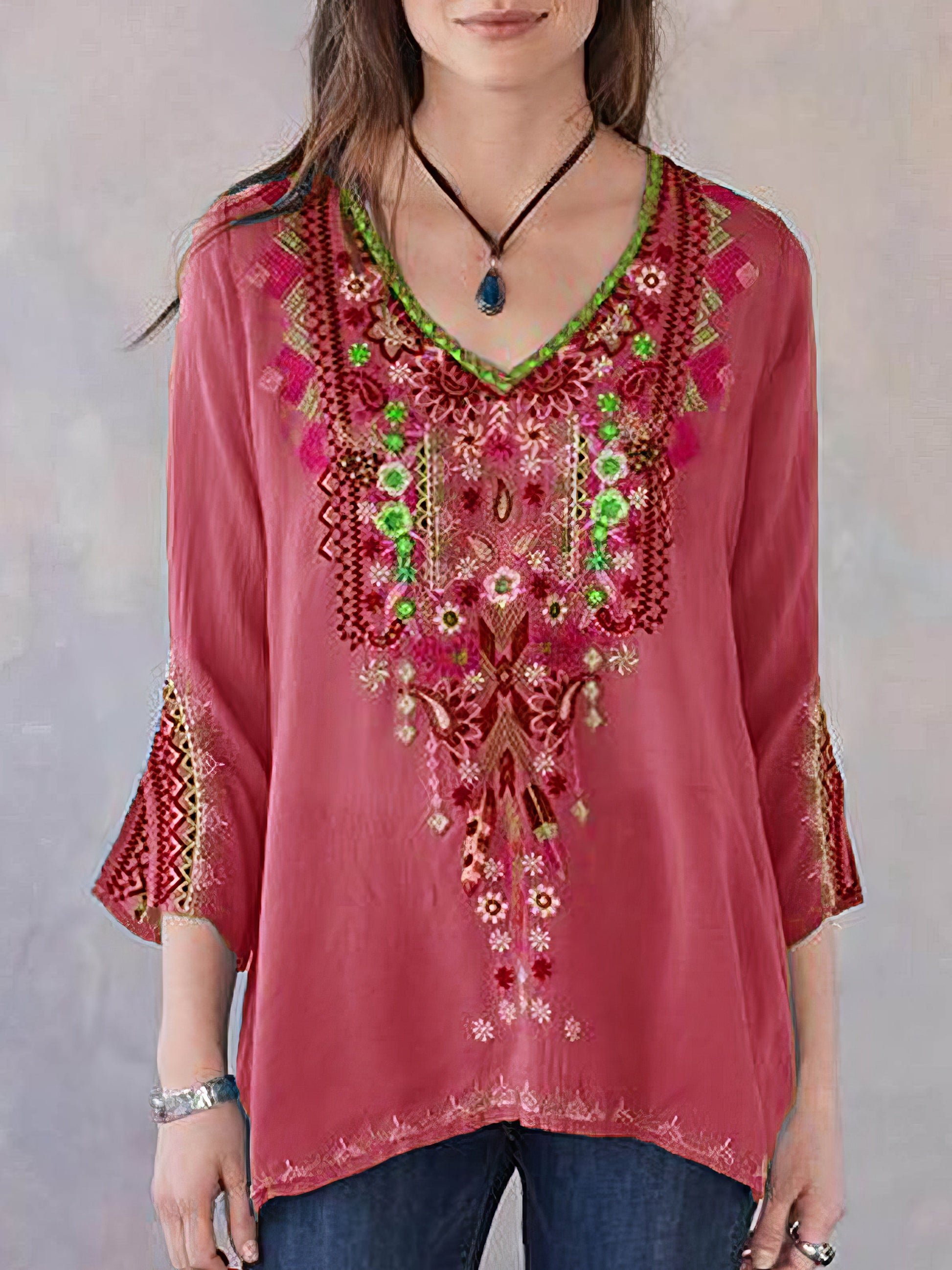 Embroidery Print 3/4 Sleeve V-neck Shirt
