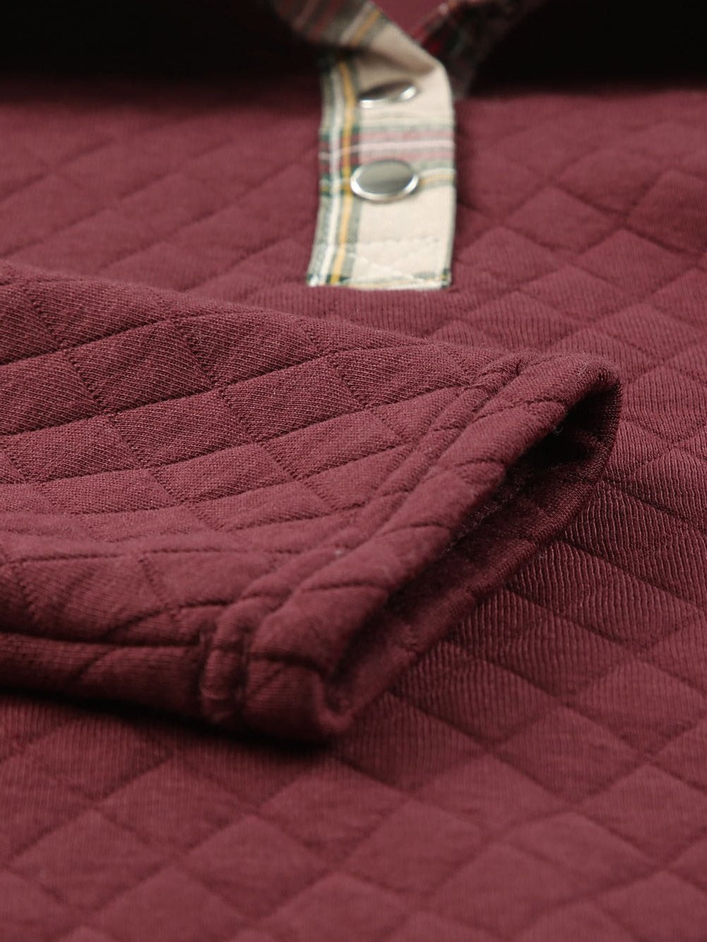 The Fiery Red Geometric Texture Plaid Trim Sweatshirt is a chic and stylish addition to your wardrobe. The sweatshirt features a unique geometric texture design and a trendy plaid trim, making it stand out. With a pullover style and front buttons, it offers both style and convenience. Pair it with jeans, pants, skirts, high heels, sneakers, or bags for a chic look suitable for various daily occasions.