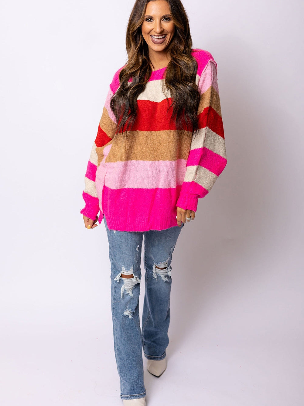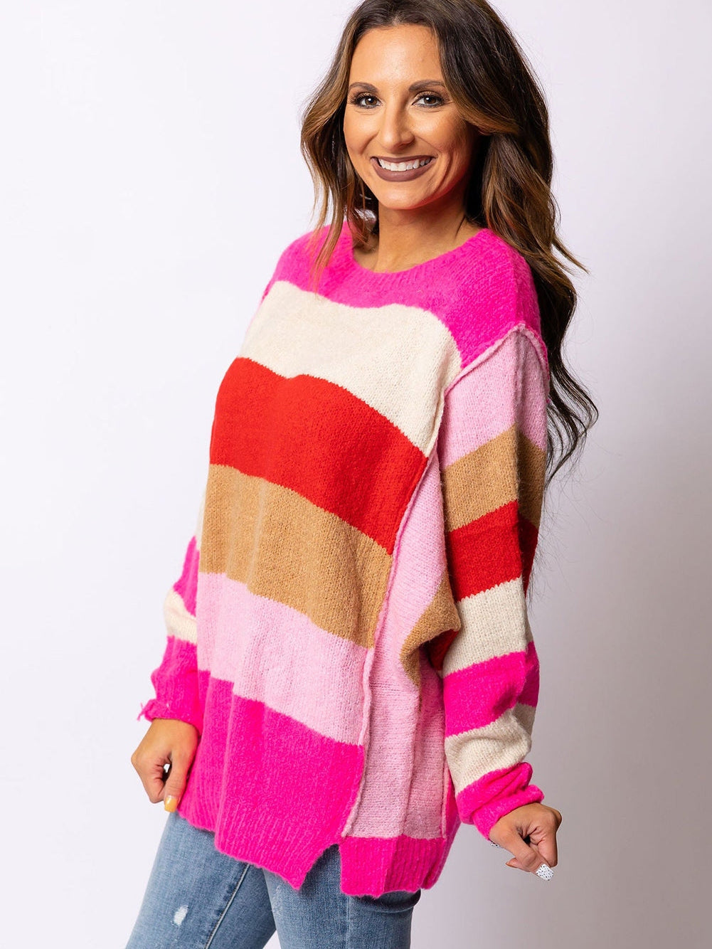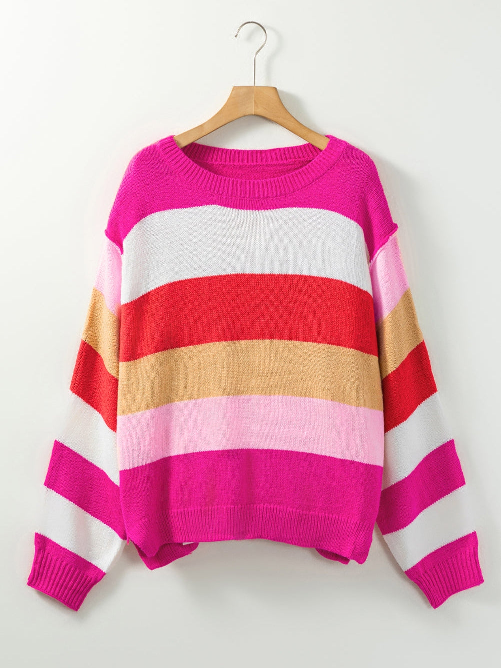 Fiery Red Mix Horizon Stripes Dolman Sleeve Pullover Sweater