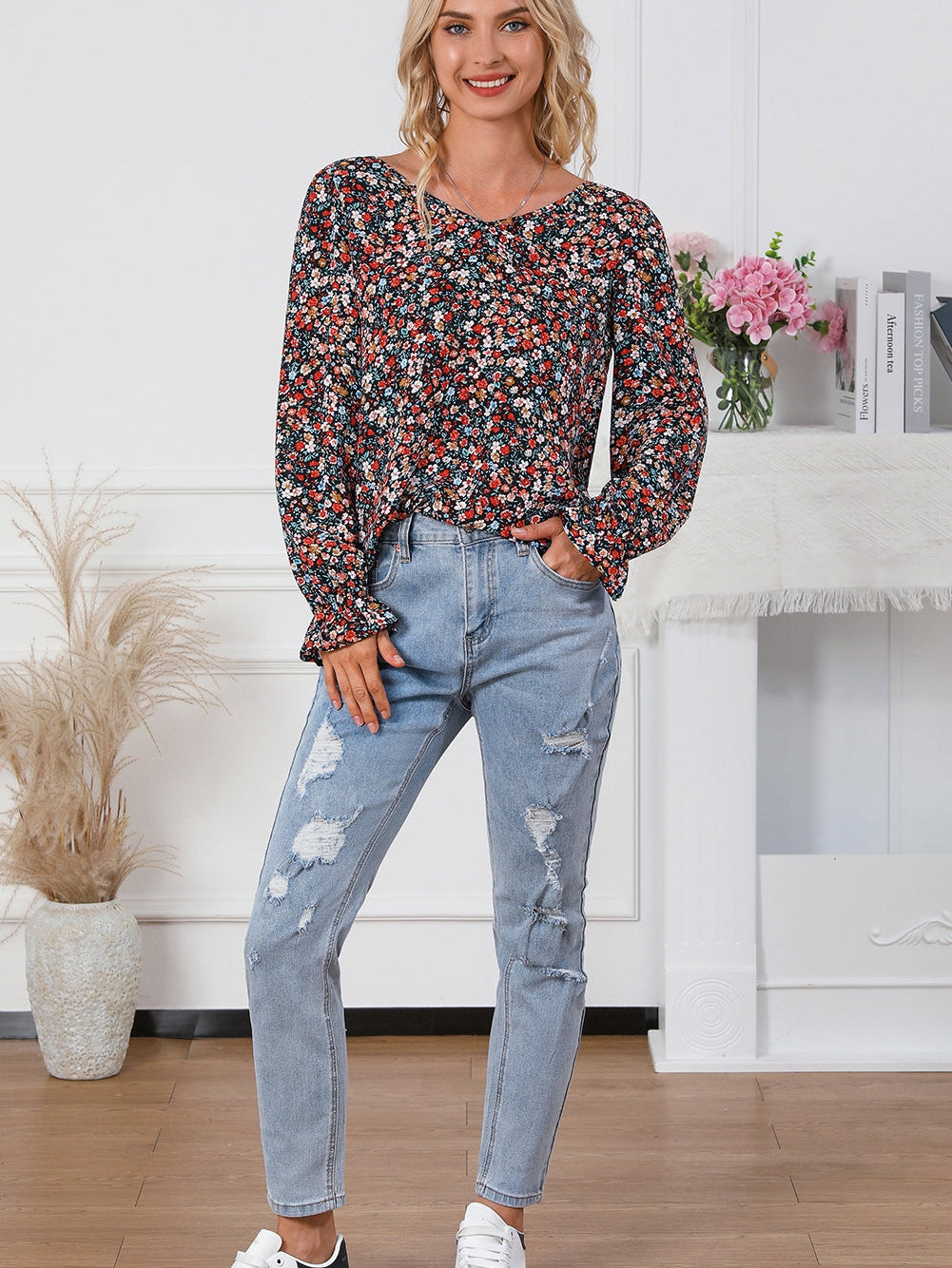 Flame Red Lace Patch V-Neck Tie-Up Puff Sleeve Floral Top