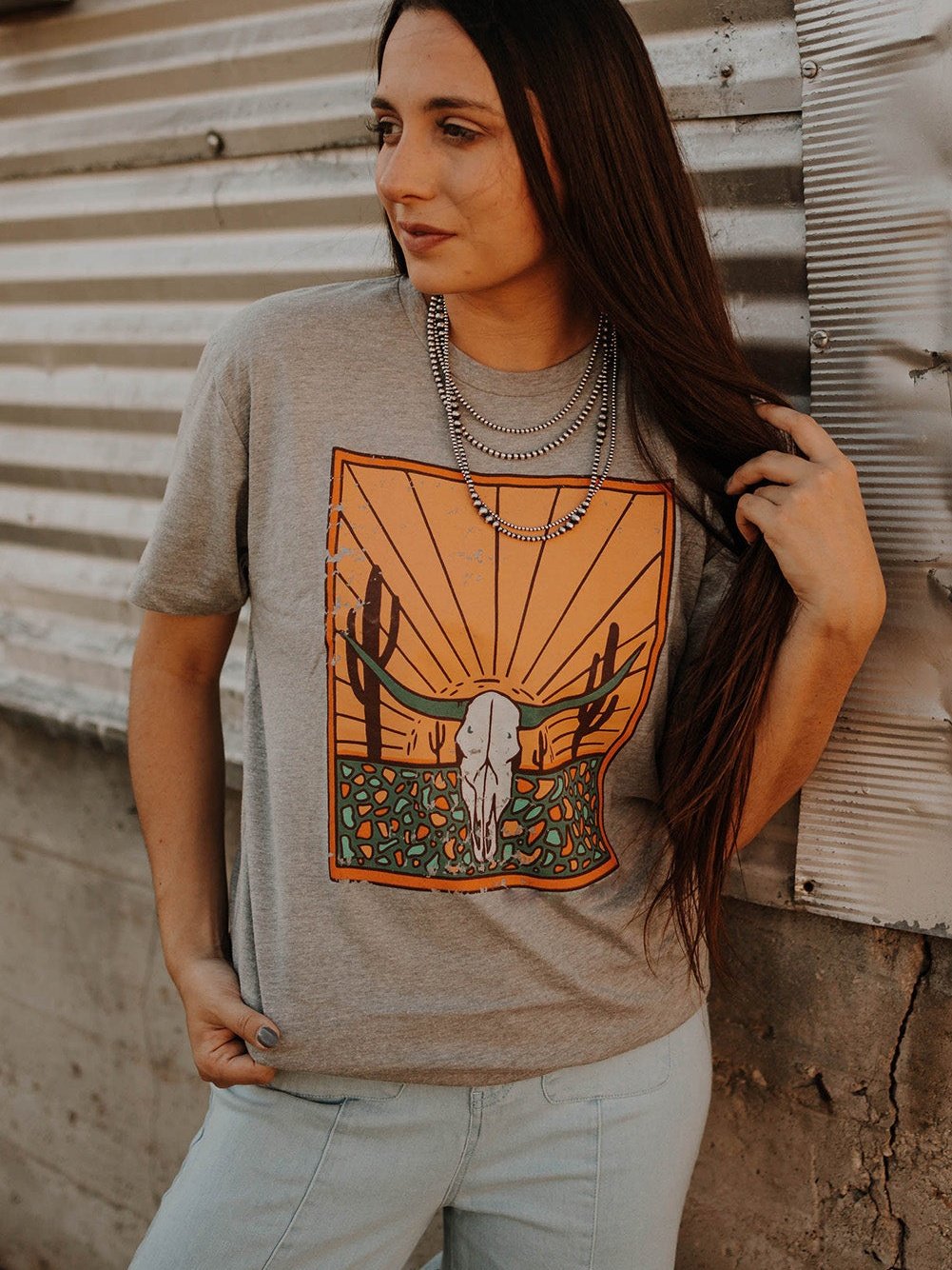 Gray Western Steer Skull Graphic Crew Neck T Shirt