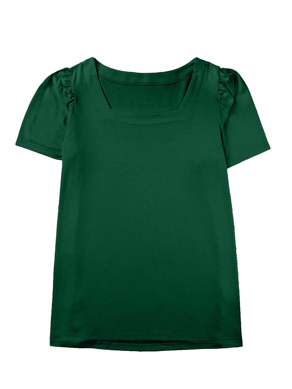 Discover a new level of sophistication with our Green Plus Size Square Neck Ruched Shoulder Short Sleeve Top. Elevate your everyday look with this stylish and versatile piece that is designed to flatter all body shapes.