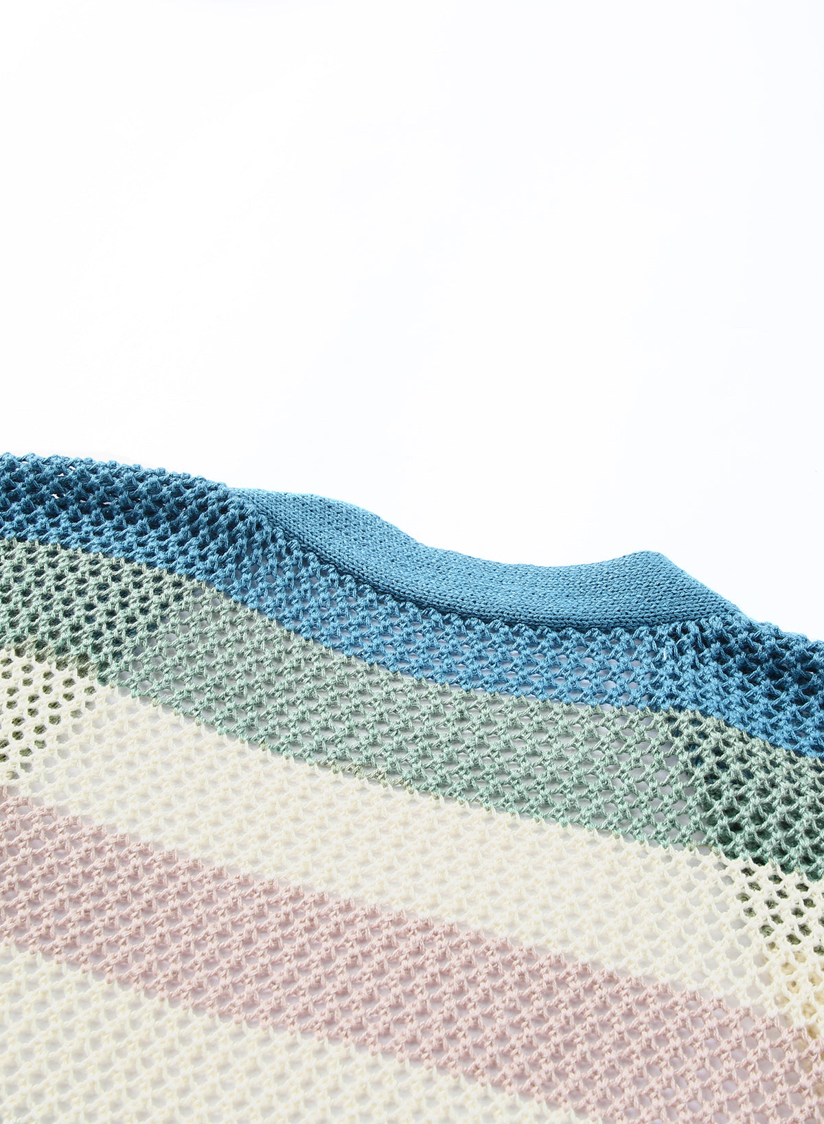 Green Hollowed Knit Color Block Striped Cardigan for Fall