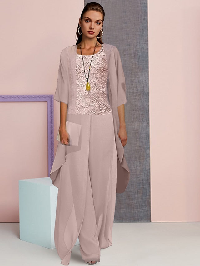 Jumpsuit / Pantsuit 3 Piece Mother of the Bride Dress Formal Wedding Guest Plus Size Elegant Scoop Neck Floor Length Chiffon Lace Sleeveless with Appliques 2023