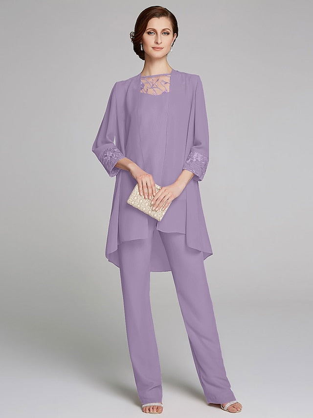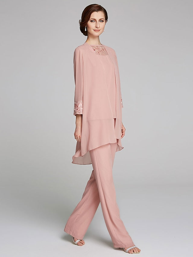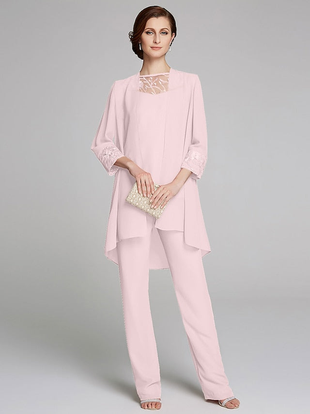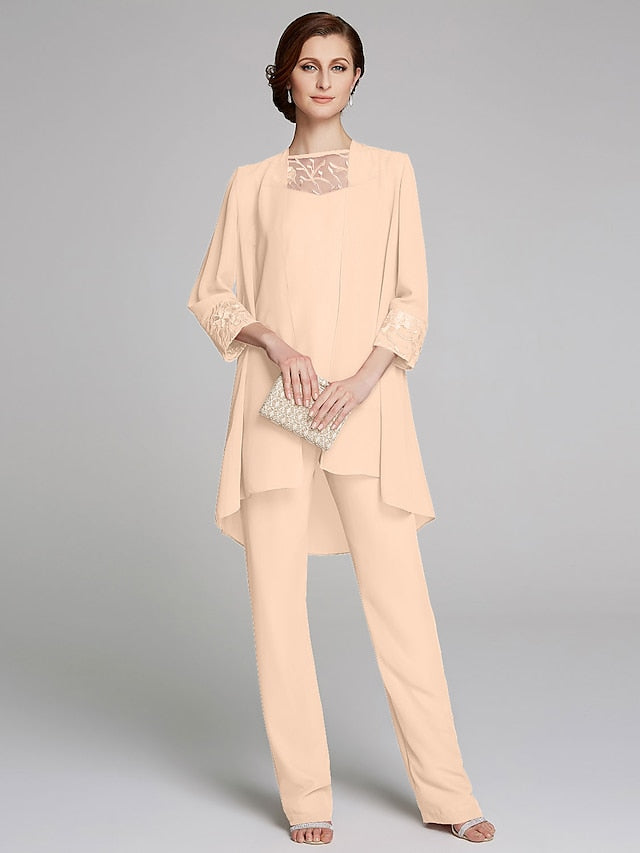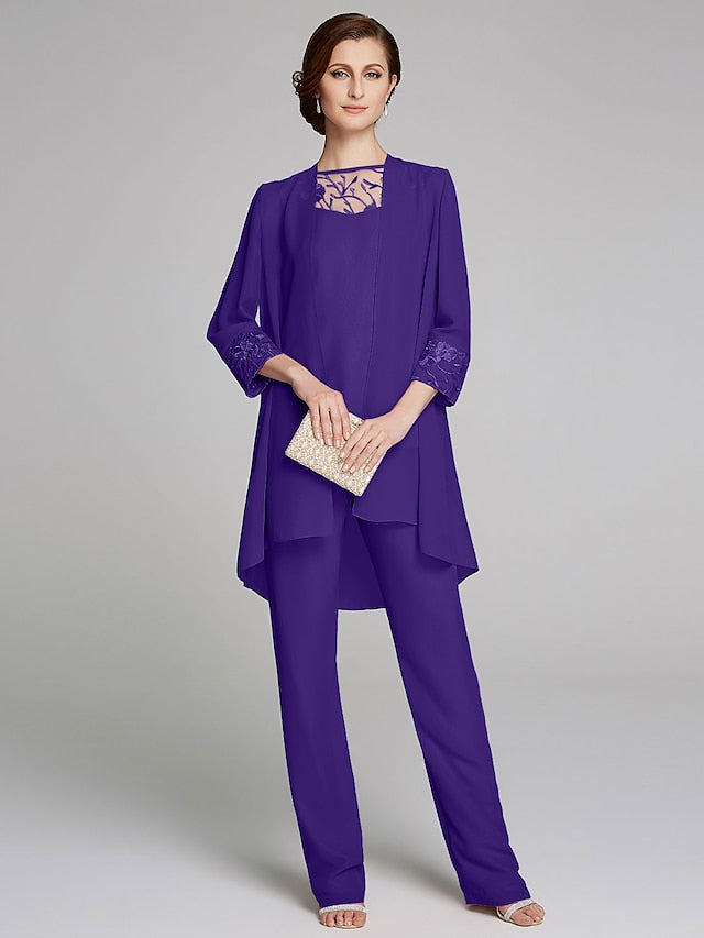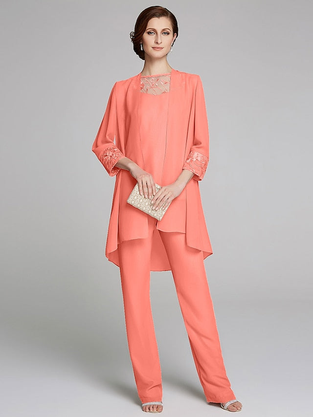 Jumpsuit / Pantsuit Mother of the Bride Dress Formal Wrap Included Jewel Neck Floor Length Chiffon Lace 3/4 Length Sleeve with Beading 2023