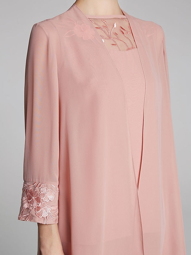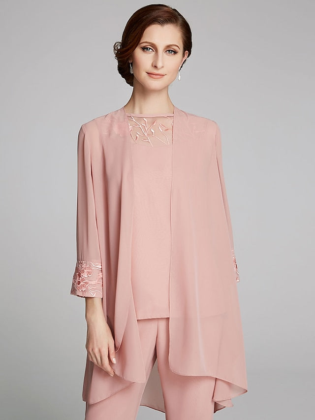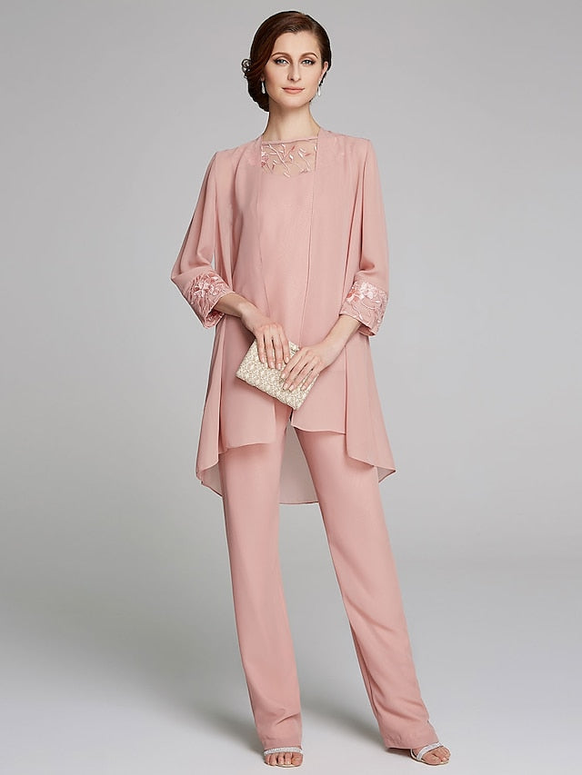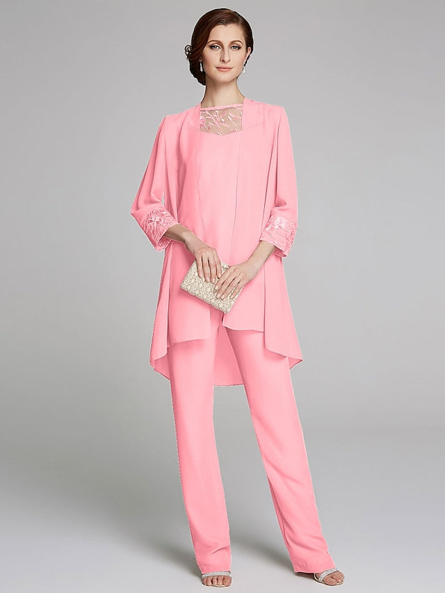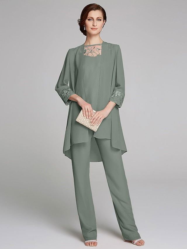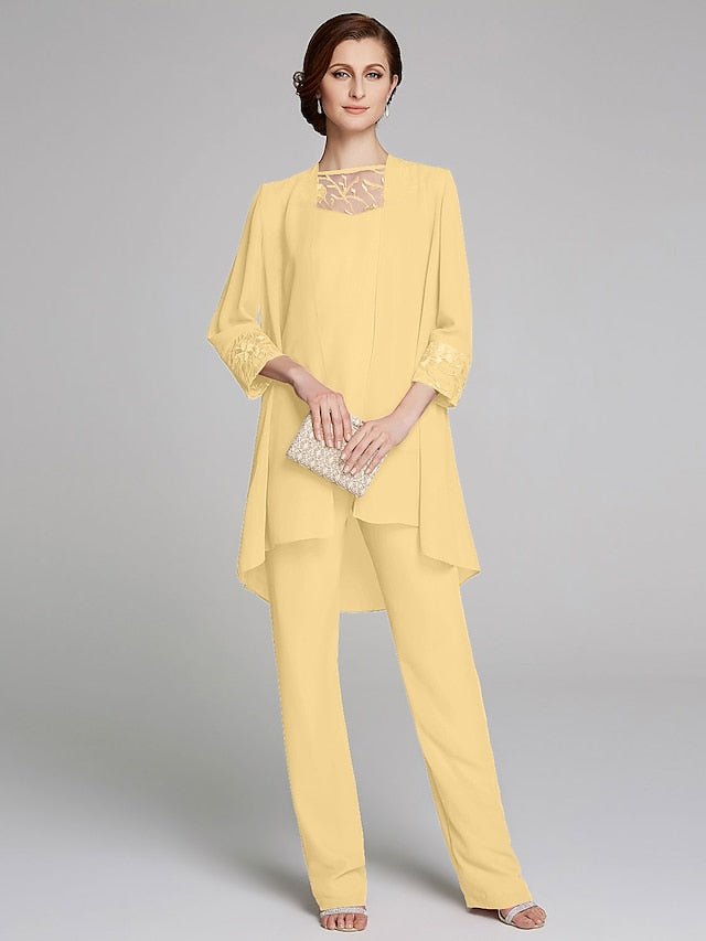 Jumpsuit / Pantsuit Mother of the Bride Dress Formal Wrap Included Jewel Neck Floor Length Chiffon Lace 3/4 Length Sleeve with Beading 2023