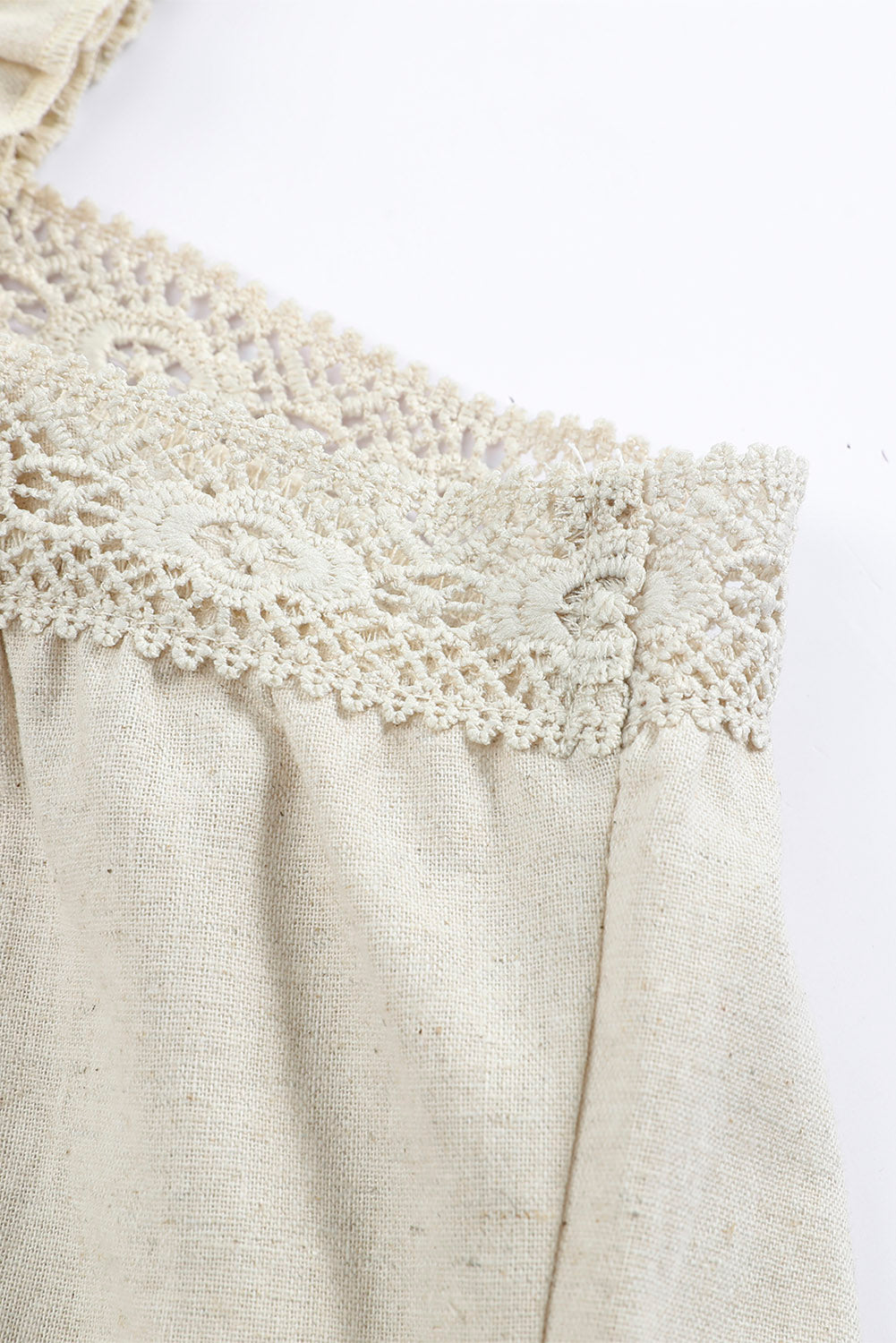 - Features square neckline, elastic ruffle straps, guipure trim, and solid khaki color