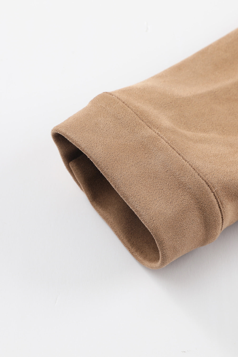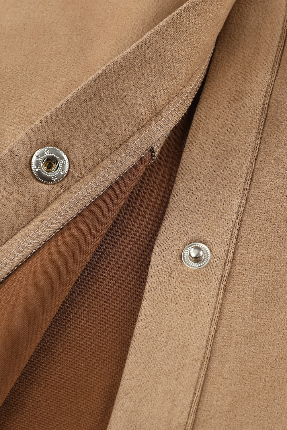 Envision attending a beautiful outdoor wedding reception, where the atmosphere is filled with joy and celebration. You don the Khaki Suede Shacket over a flowing maxi dress, adding a trendy layer that still feels appropriate for the occasion. The soft suede and fringe details catch the light as you dance and enjoy the festivities, while the easy snap button closures allow for quick adjustments as the evening cools down. Your style effortlessly transitions from ceremony to celebration, ensuring you look fabulous all night long.