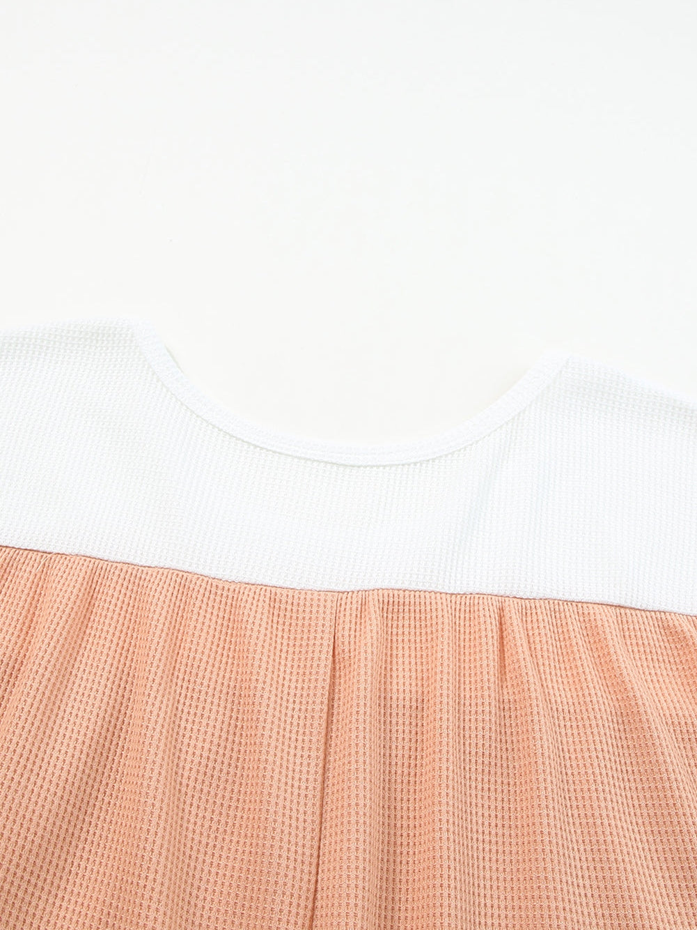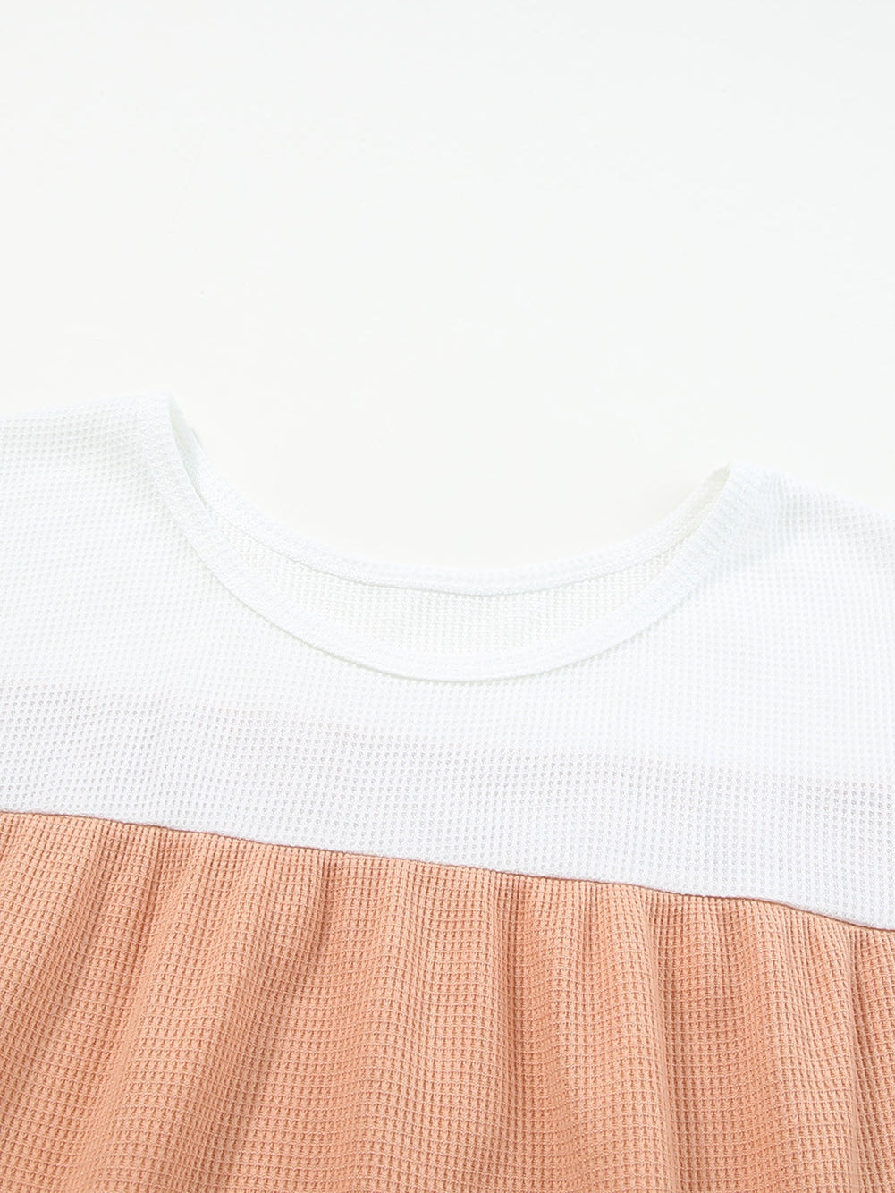 The stylish ruffled detailing adds a touch of sophistication, while the eye-catching leopard print sleeves elevate your style game. The comfortable waffle knit fabric ensures you stay at ease all day long.