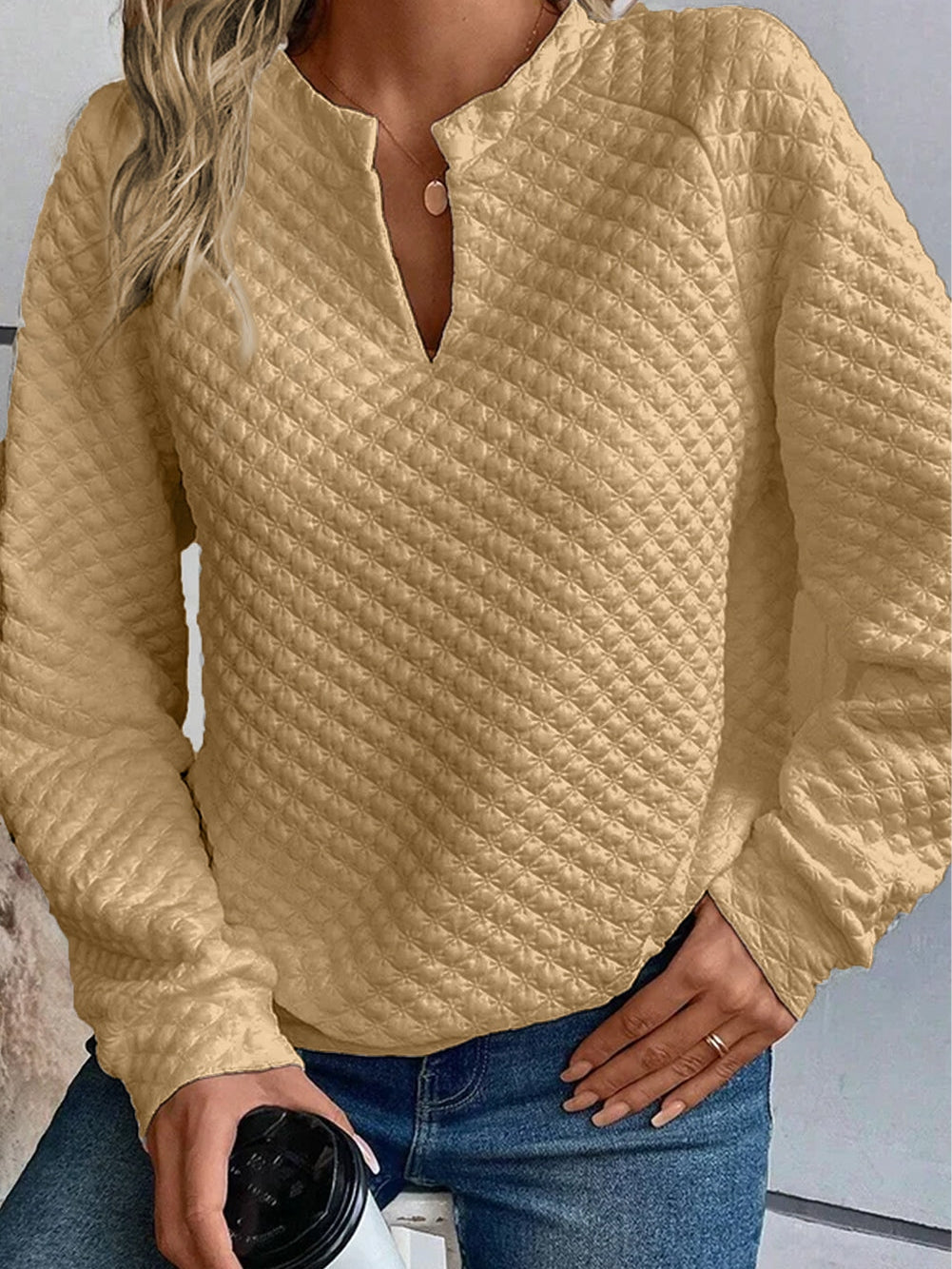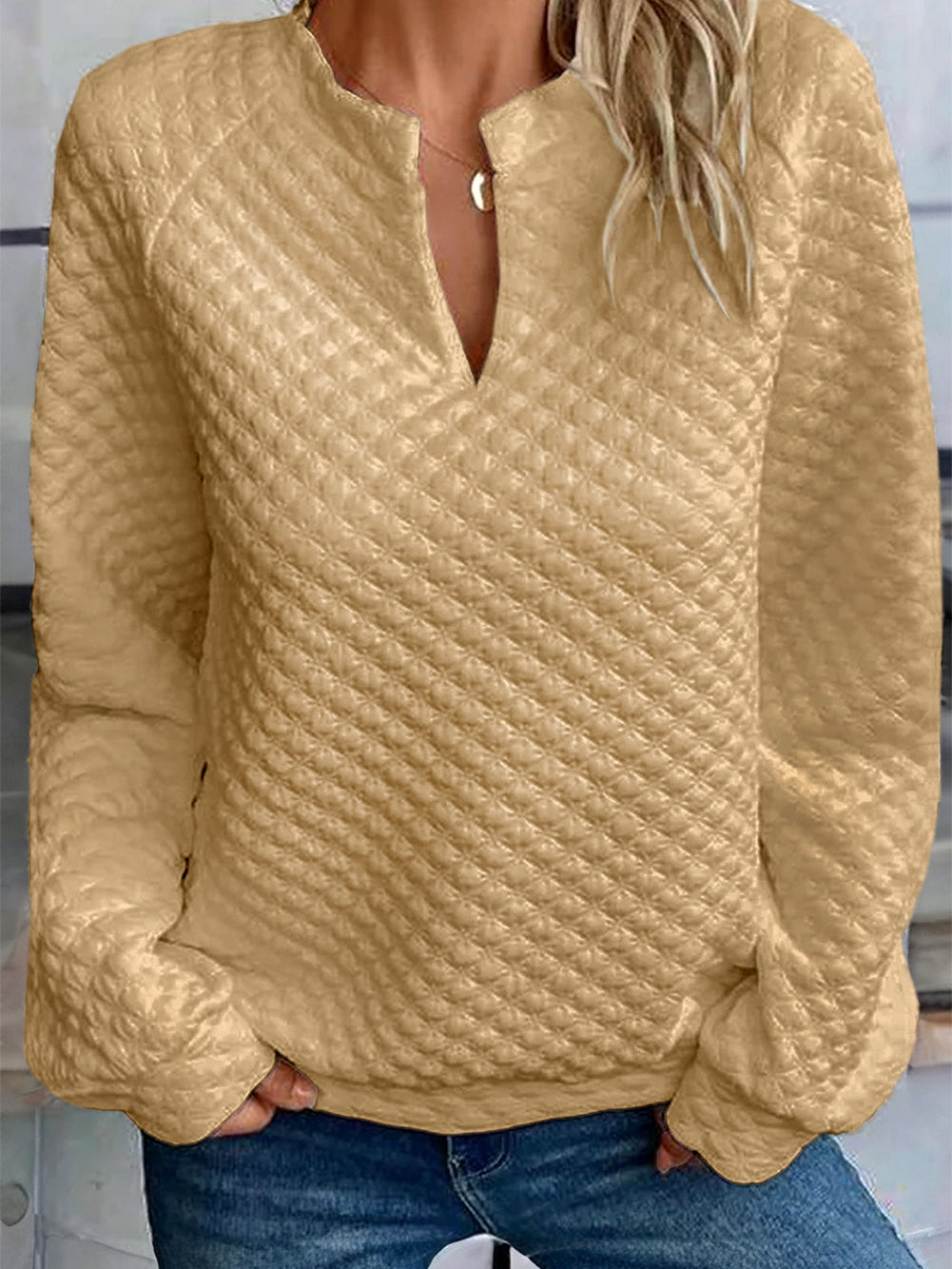 Enhance your wardrobe with our Khaki Split Neck Quilted Long Sleeve Top. This chic and textured top is a versatile piece suitable for various occasions.