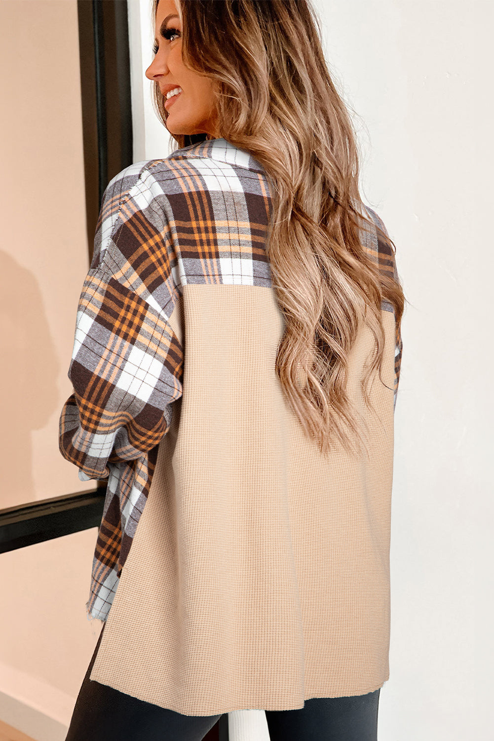 Step into fall with our Khaki Thermal Knit Plaid Patchwork Shacket, where comfort meets style. This versatile outerwear piece is designed to keep you warm while ensuring you look effortlessly chic.
