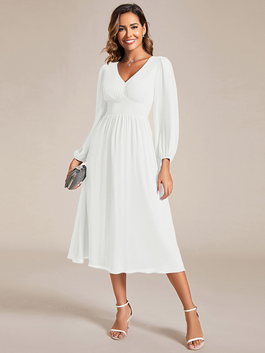 Elegance meets comfort with our Knee Length Chiffon Wedding Guest Dress. The high-waisted design, slimming silhouette, pleats, and lantern sleeves add a touch of sophistication. Perfect for product launches, this dress embodies grace and style. Elevate your collection with this timeless piece.
