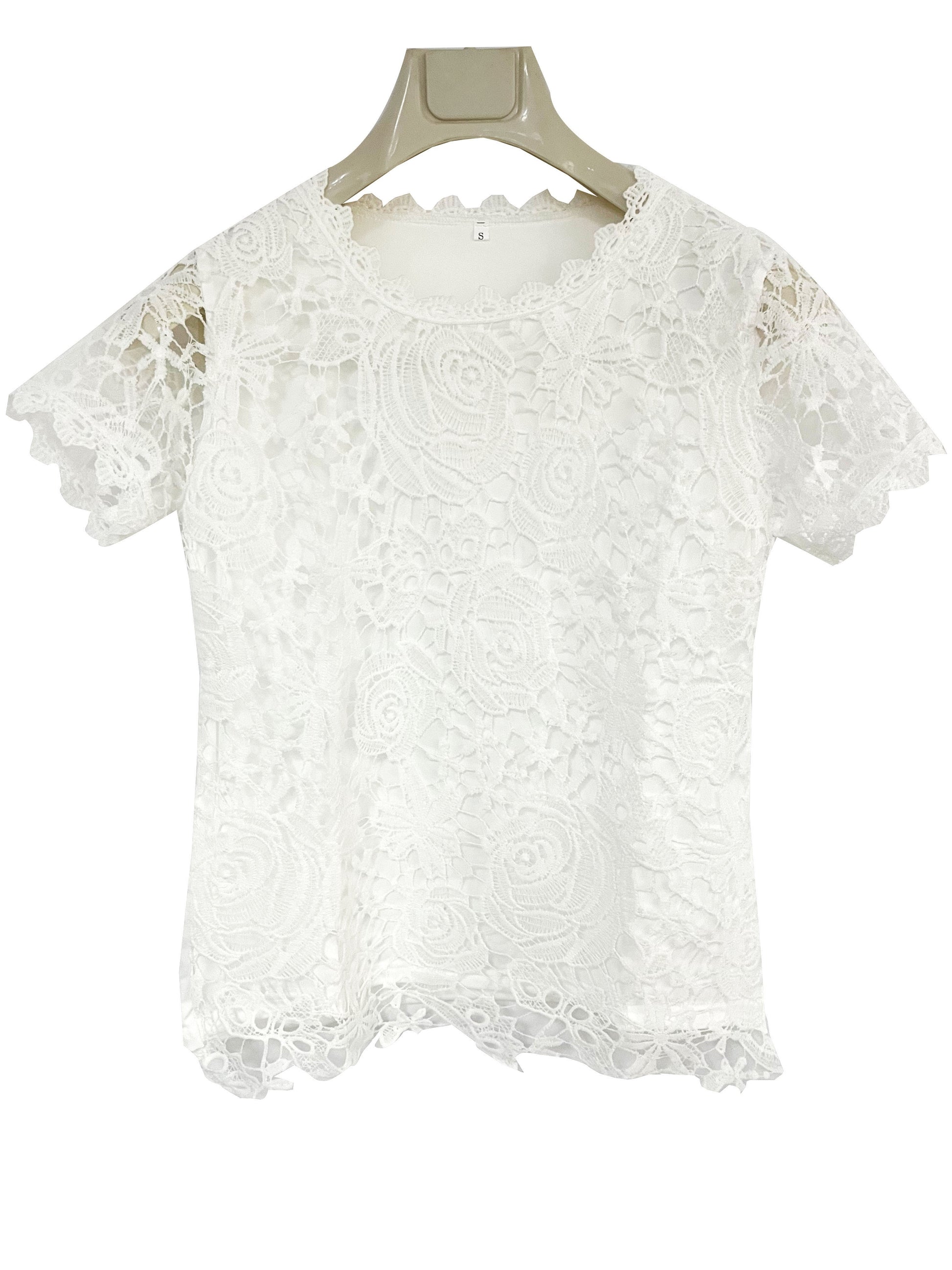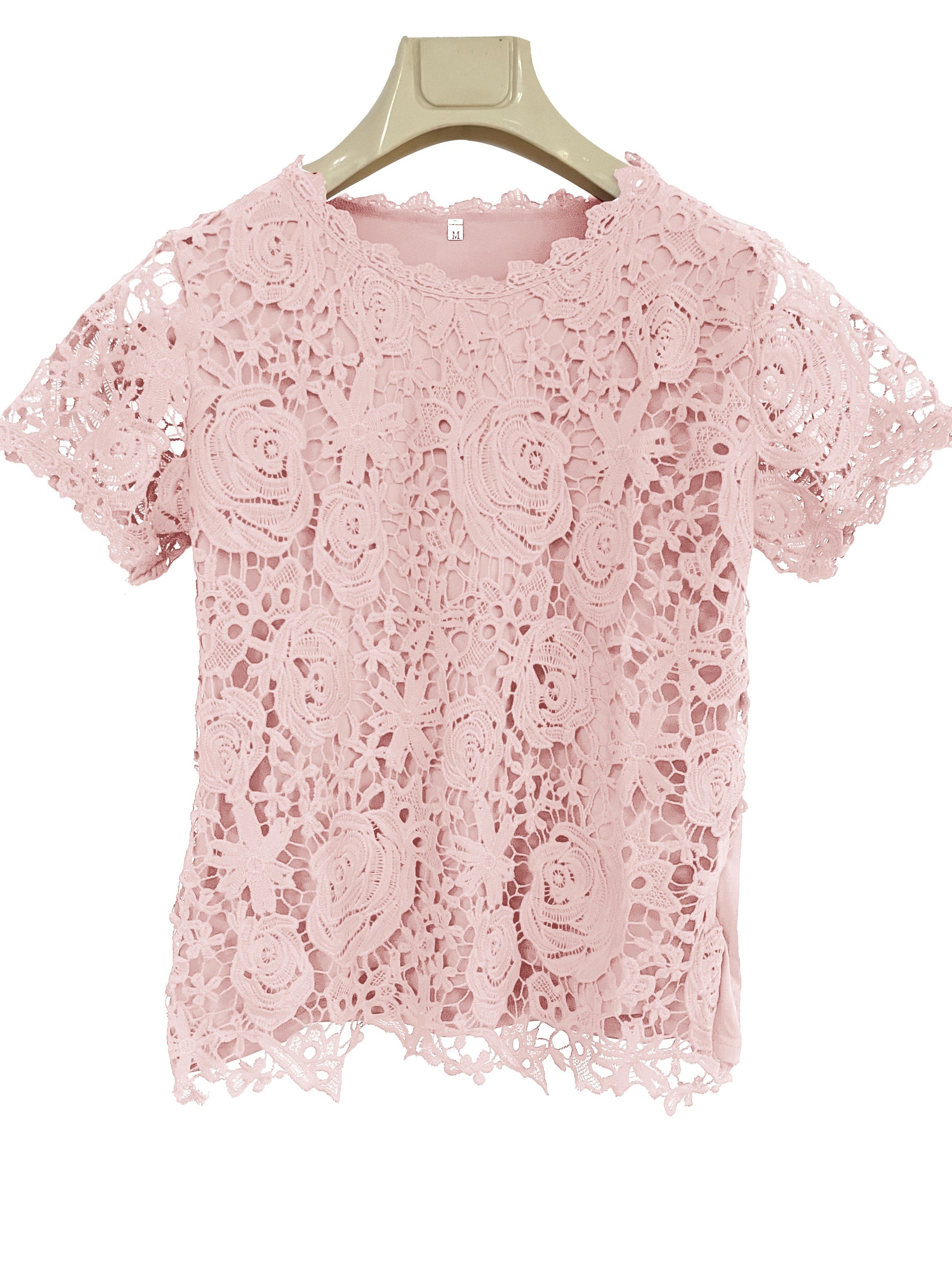 Lace Crew Neck T-Shirt, Elegant Short Sleeve T-Shirt For Spring & Summer, Women's Clothing