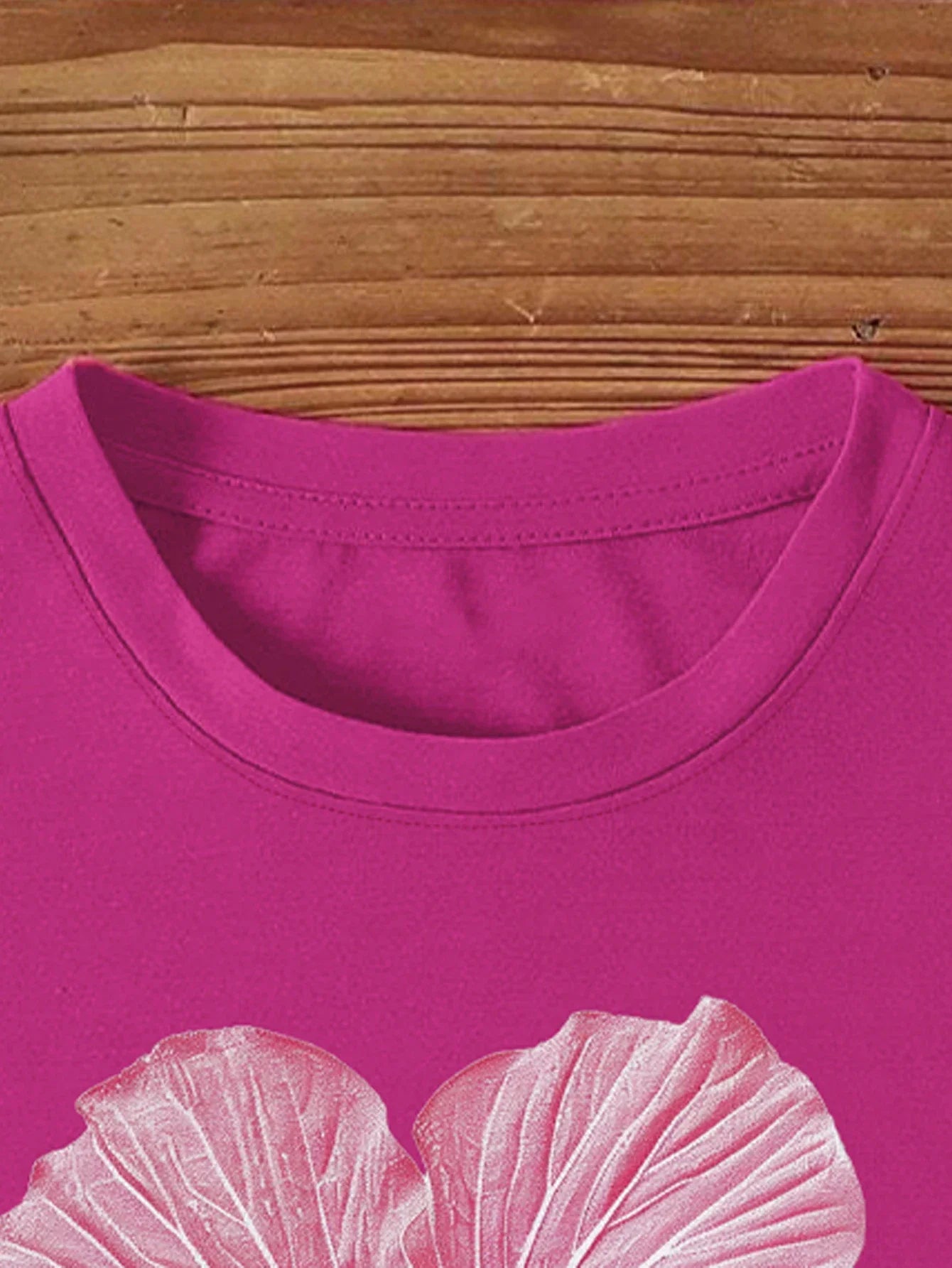 Large White Hibiscus Flower Print T-shirt Short Sleeve Crew Neck Casual Top For Summer & Spring Women's Clothing