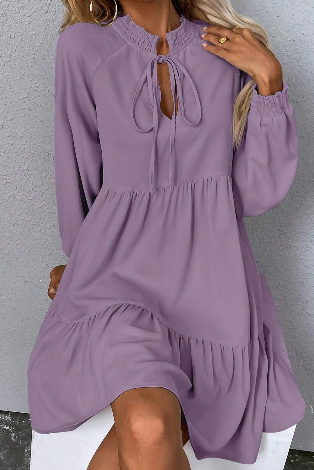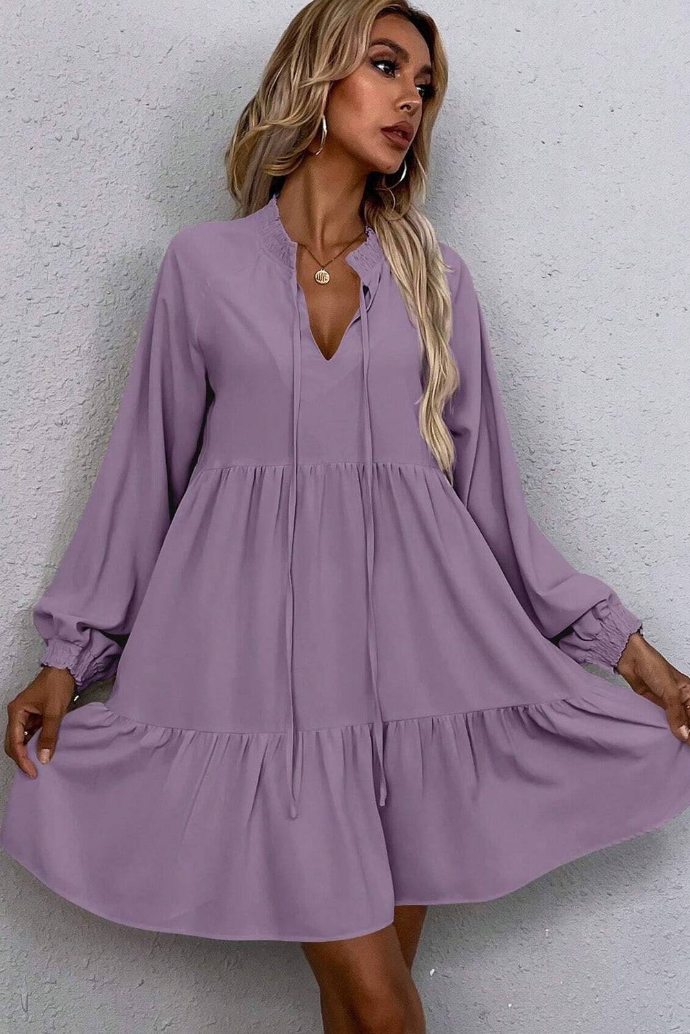 Lavender Women's Casual Chic Tie Neck Smocked Puff Sleeve Dress with Ruffle Hem – Perfect Fit for Any Occasion
