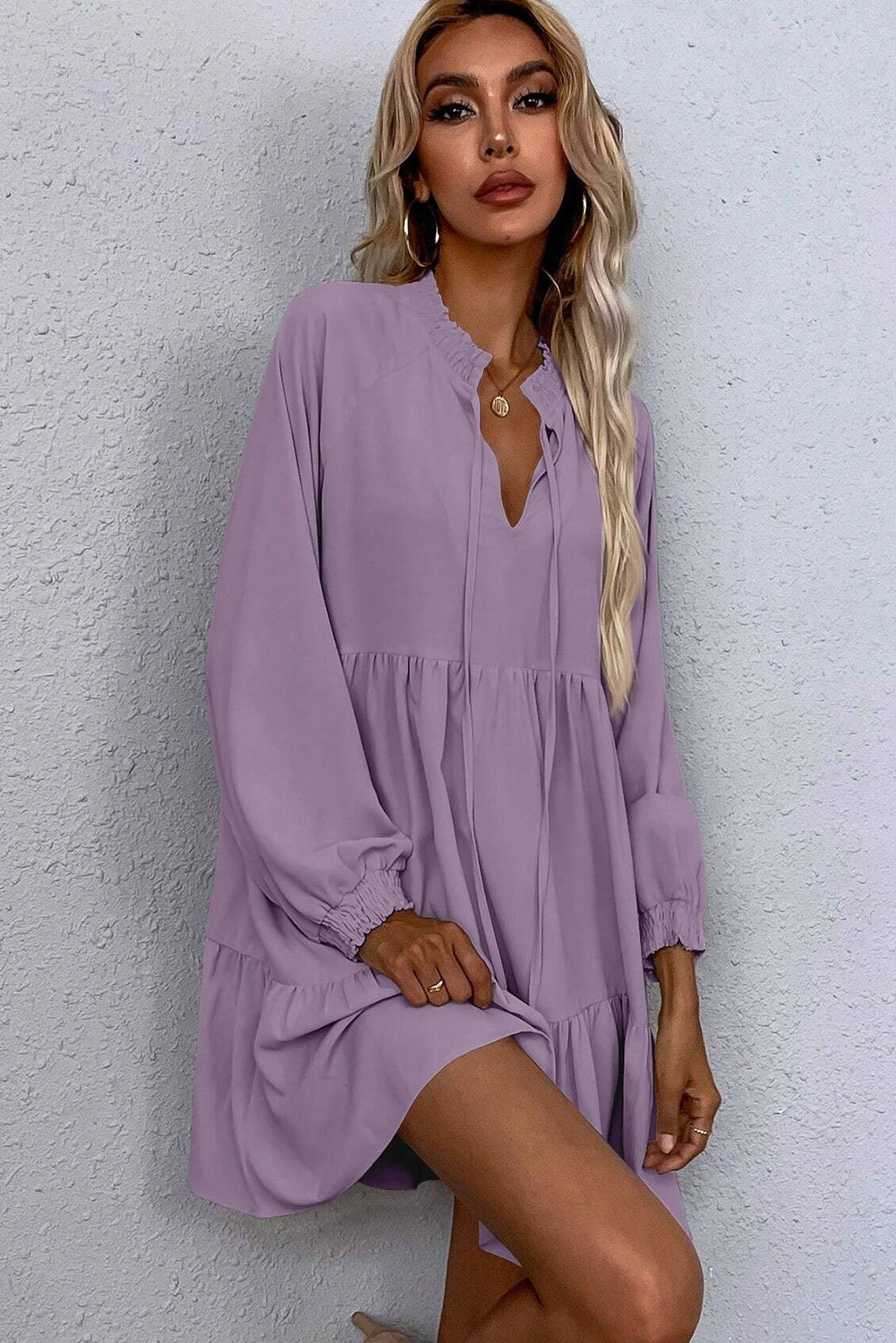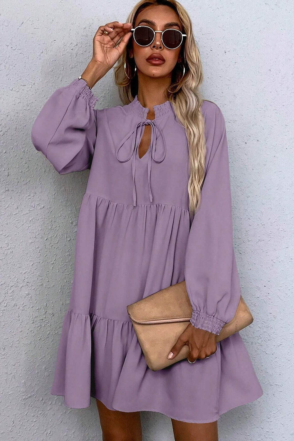 Description Specifications Item No LC6126474-P908 Product Weight 0.34KgCategory Pre Order > Pre Order Dresses Creation Time 2025-08-07Material 100%Polyester Style casualPattern solid Occasion beach,Daily,Vacation,Outdoor,Date,Back to schoolDetails Knot Dresses Length ShortSilhouette Shift Sleeve Length Long SleeveWaist Line High Waist Color Lavendula Detail Tie split neck offers adjustable styling with delicate feminine appeal.Smocked detailing creates flattering stretch with textured visual interest.Long puff sleeves add dramatic volume and romantic statement elegance.Ruffle hem provides playful movement and completes the graceful silhouette.Wholesale dresses ensure comfortable wear with effortless chic styling.